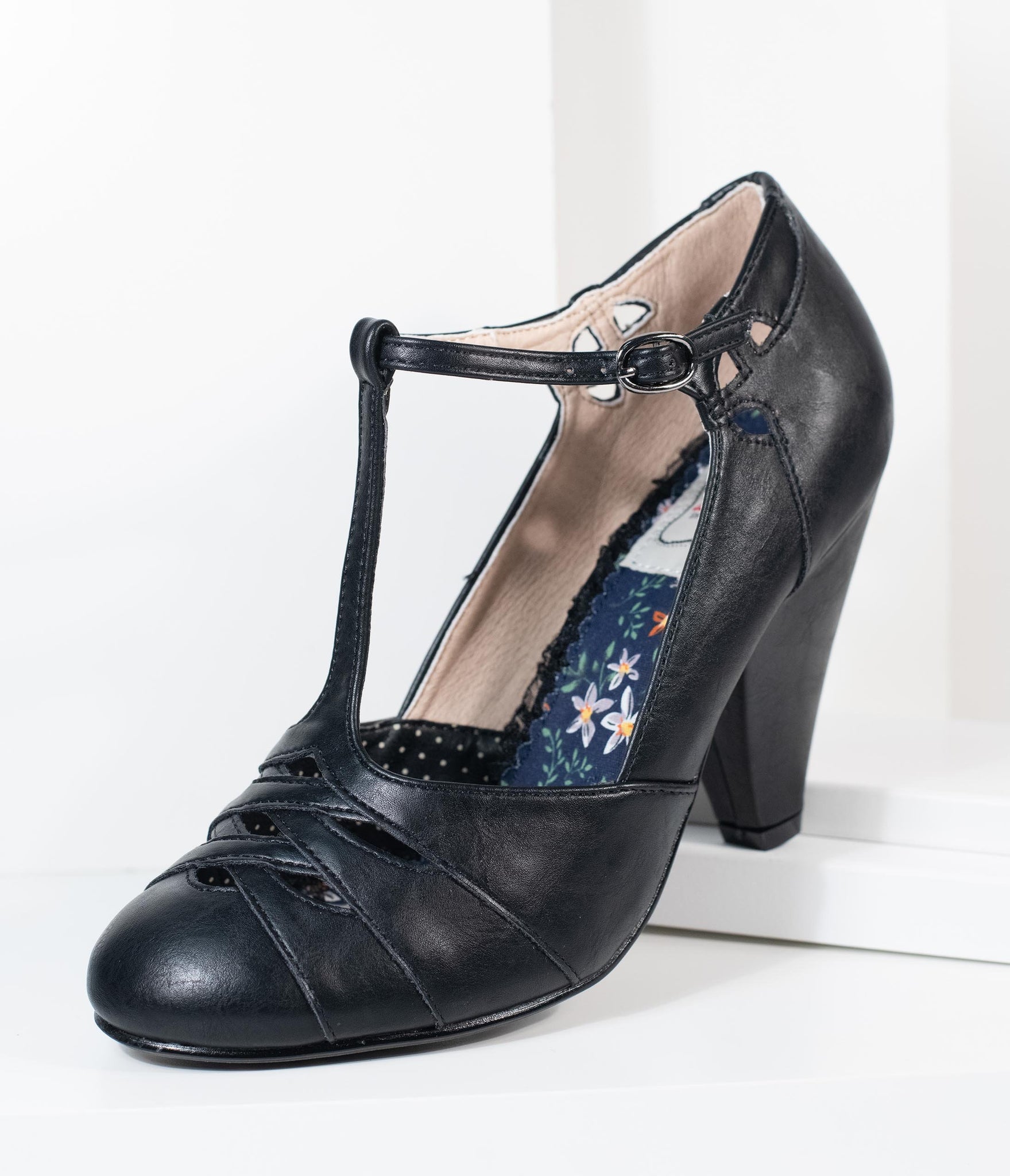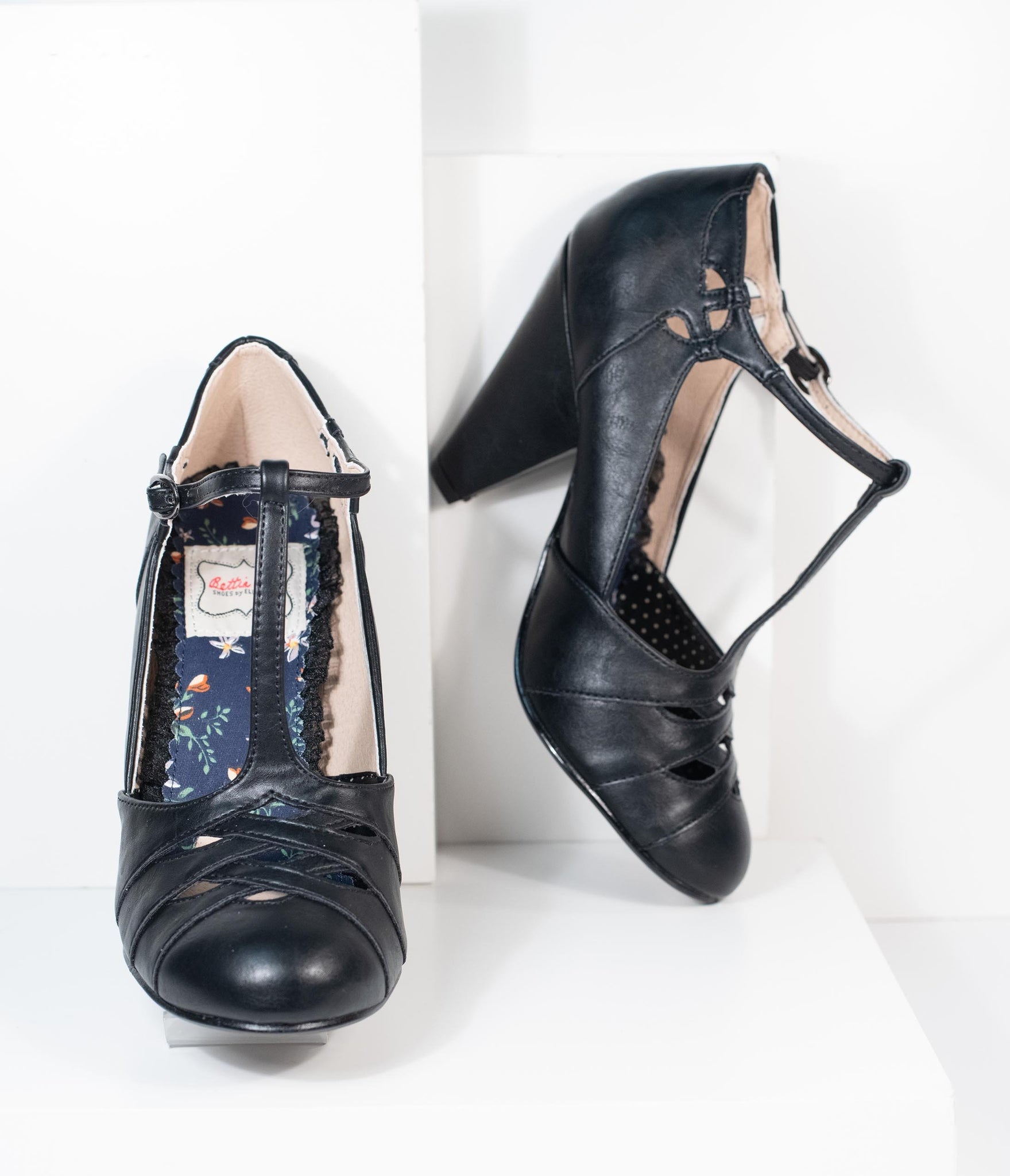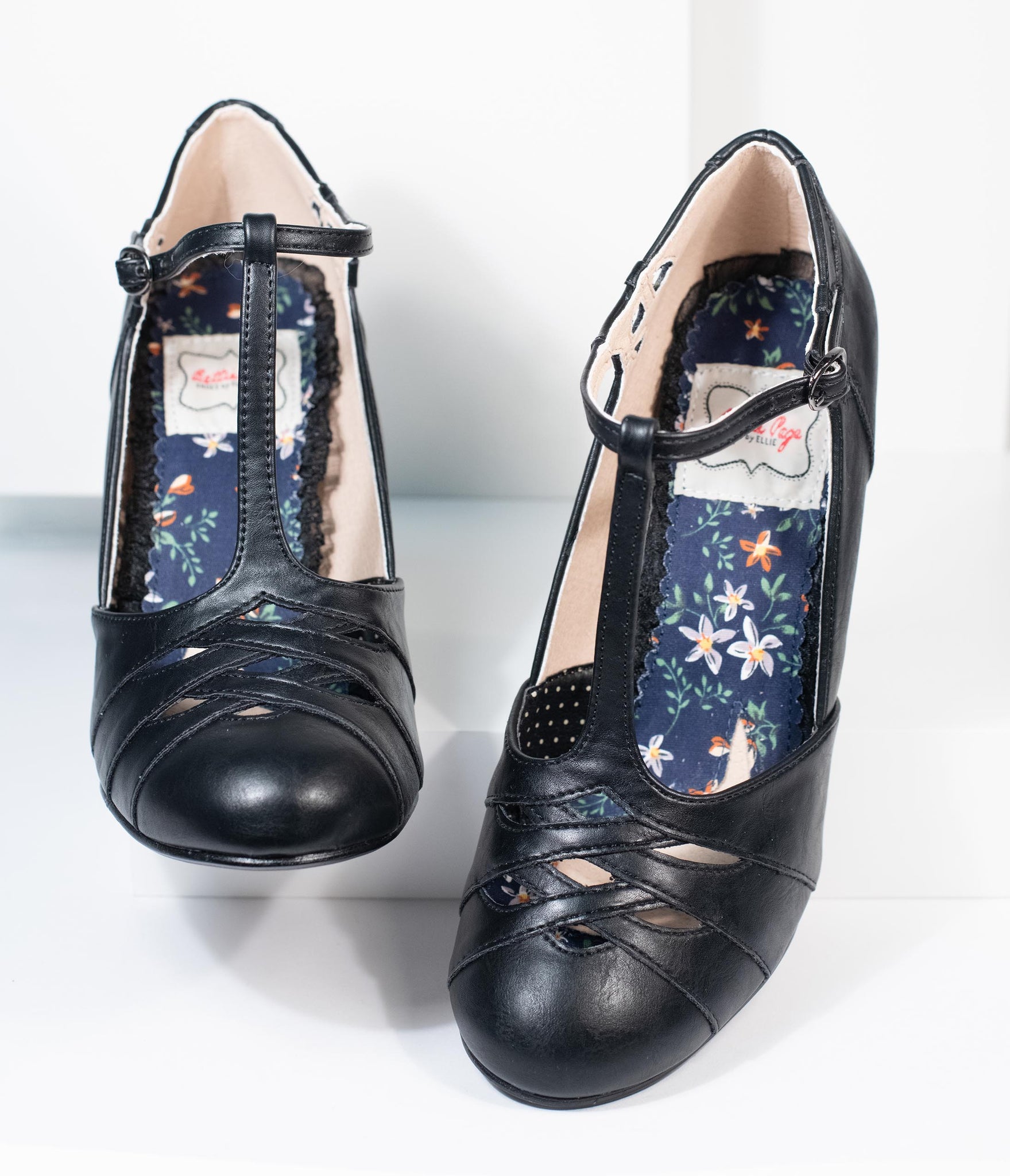 Charmingly cute and endlessly endearing, the Laura Heels from Bettie Page are a delightful pair crafted in a black leatherette and featuring sweet cutout detail throughout the vamp. The fabulous 4 inch cone heel and adjustable t-strap provides stunning feminine vintage style while the cushion insole keeps you comfortable.