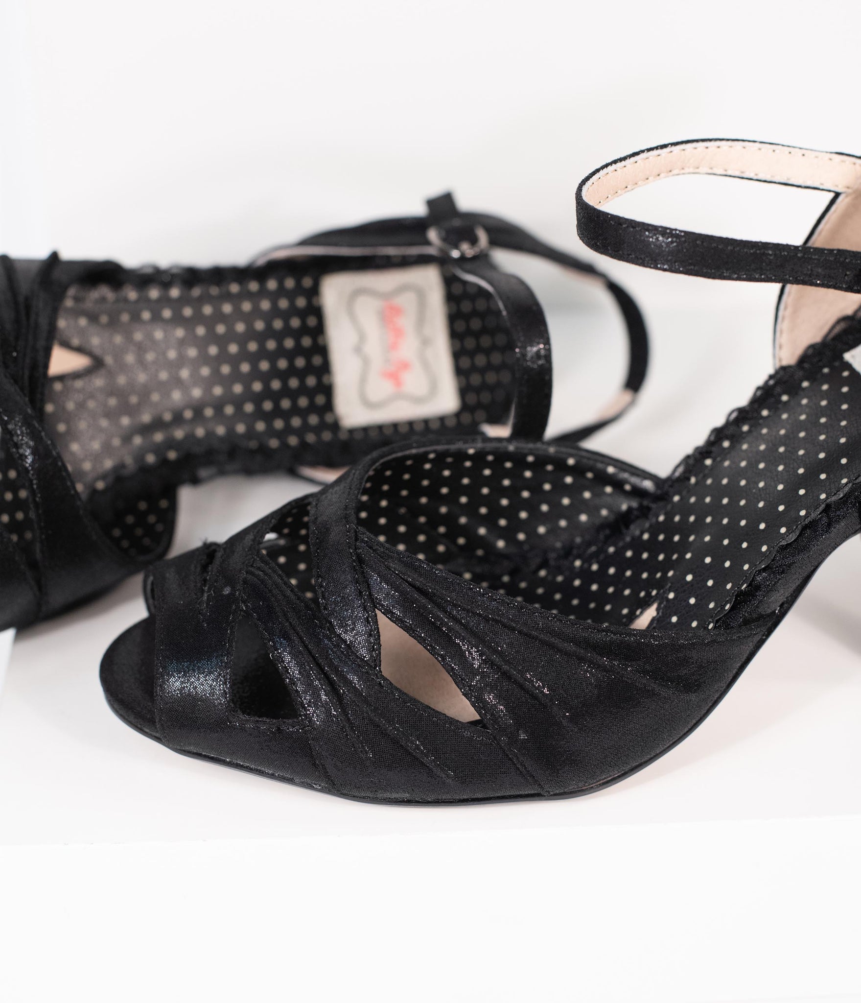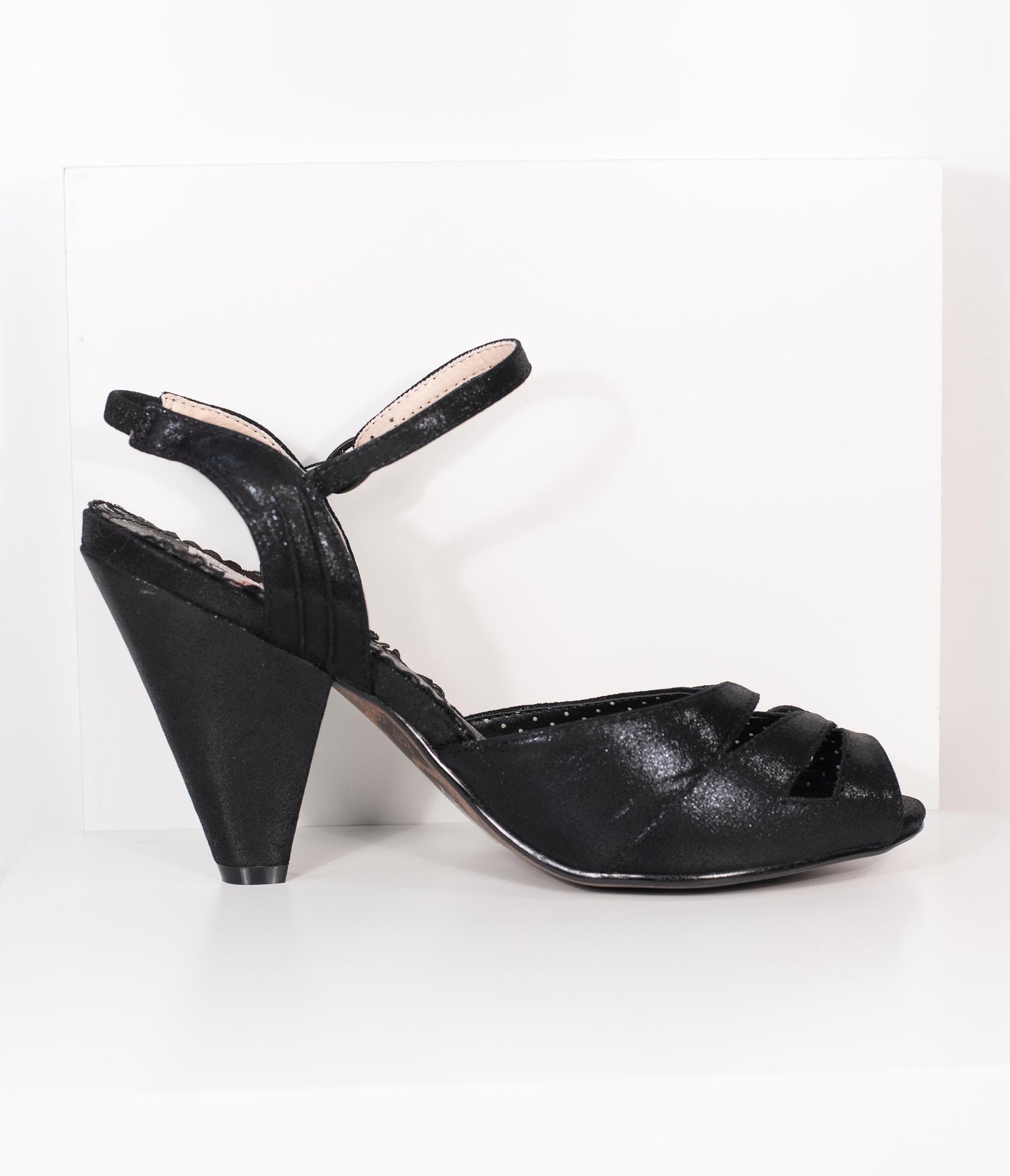 What's not to adore, darlings? A shimming pair of charming kicks, these gleaming black heels from Bettie Page twinkle with metallic threading. The graceful peep toe boasts a lovely cutout vamp as the adjustable and gored ankle strap provides a secure fit. A 4 inch heel and cushion insole makes it worthy of a standing ovation!