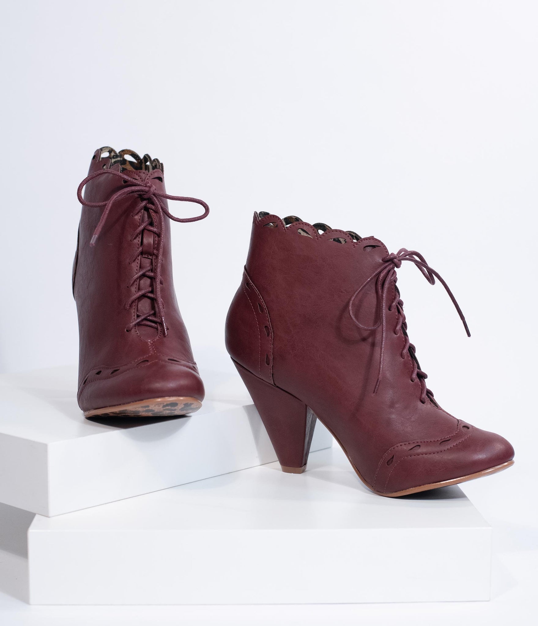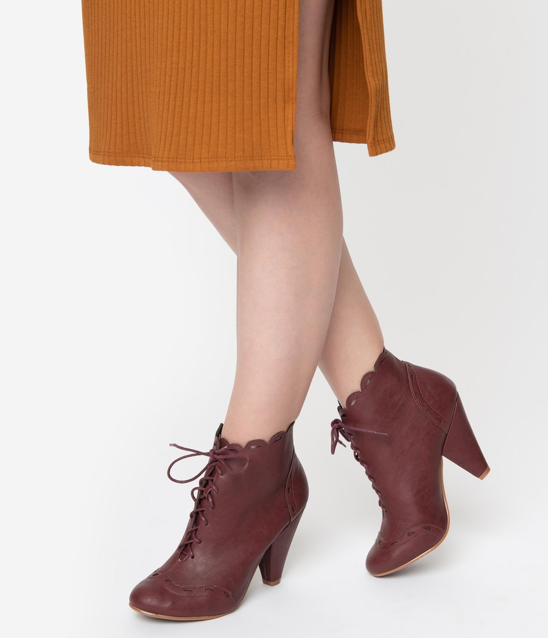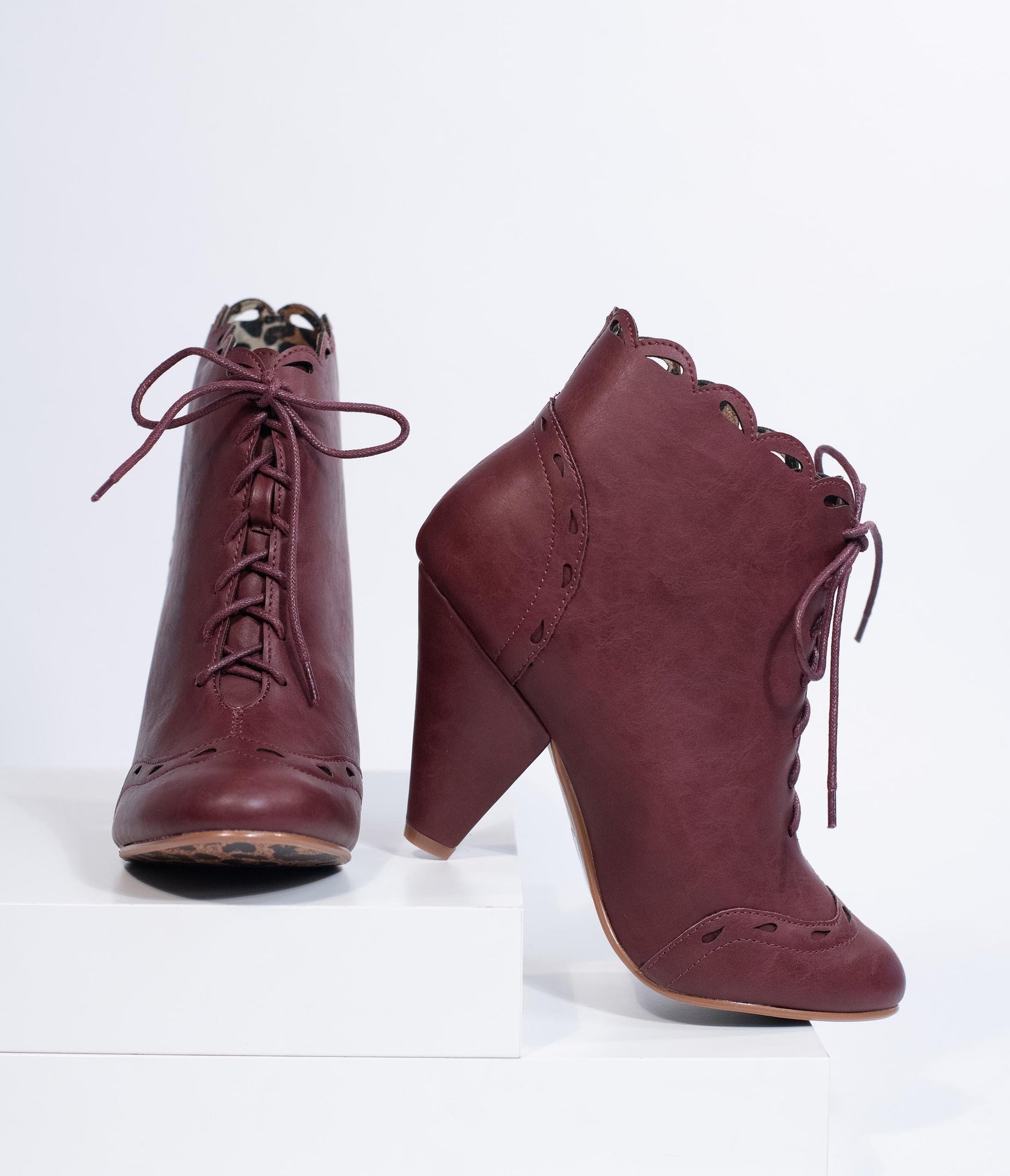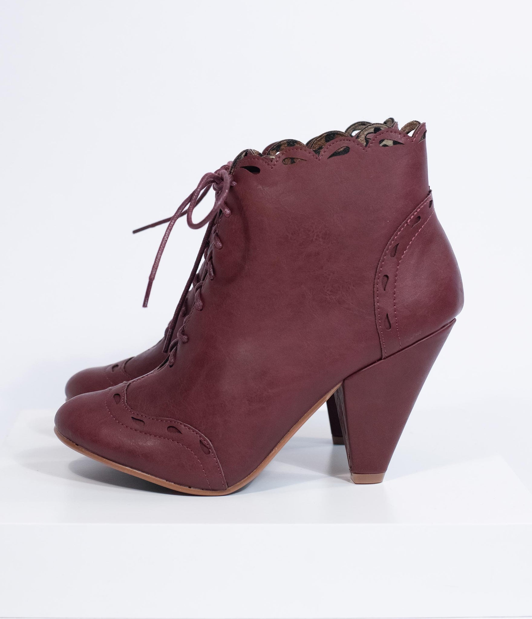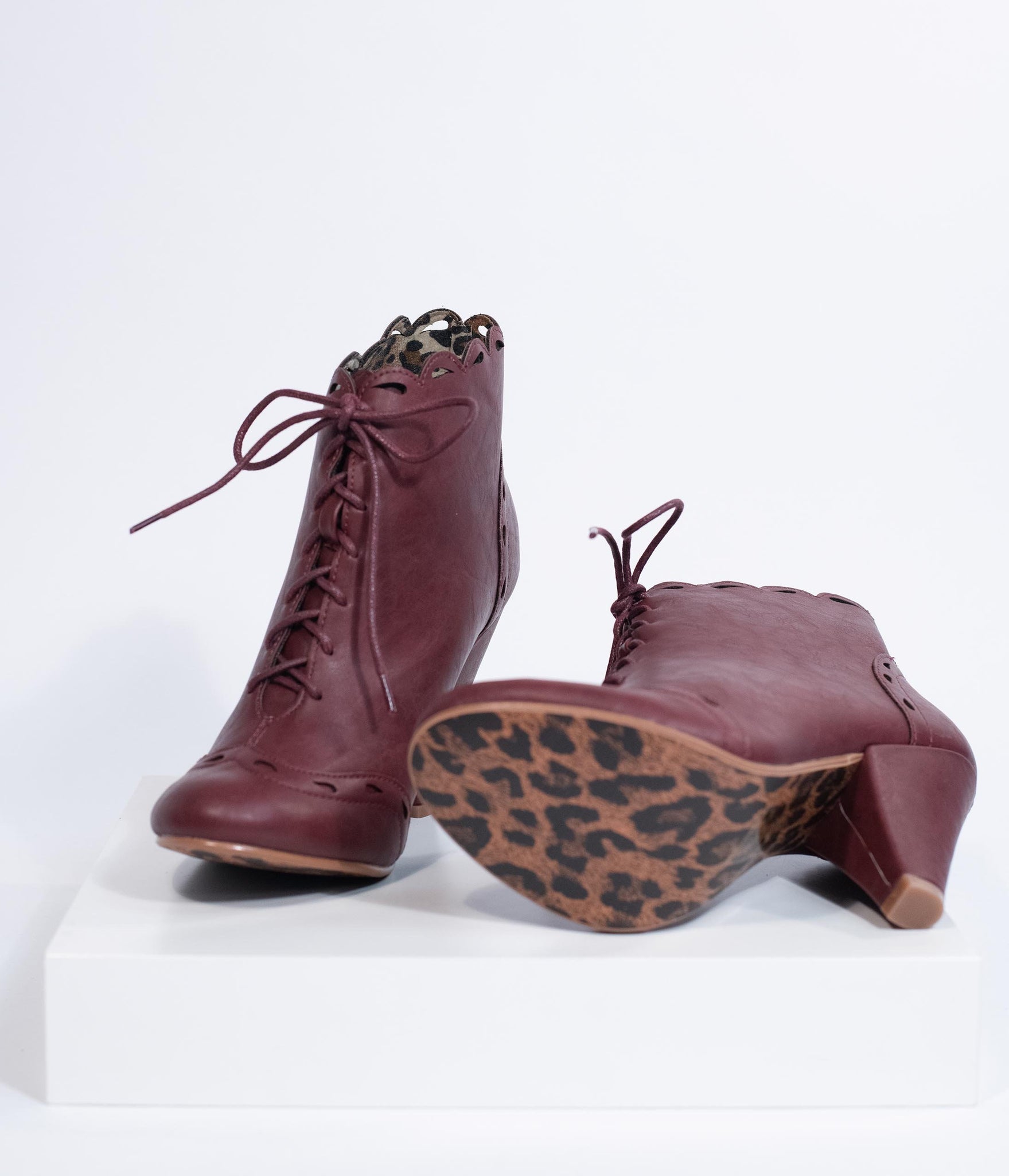 We've got butterflies, dolls! These whimsical booties from Bettie Page are crafted in burgundy red leatherette and feature a spectator accent on the toe and heel. Secured with a vintage styled lace up front and outfitted with a dramatic 4” lift, the soft cushion insole and polka dot interior turn this into a pair of favorites!