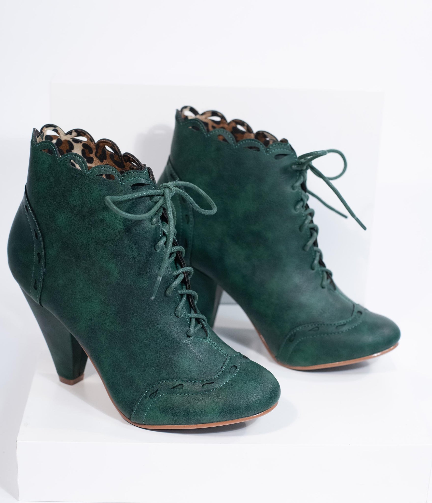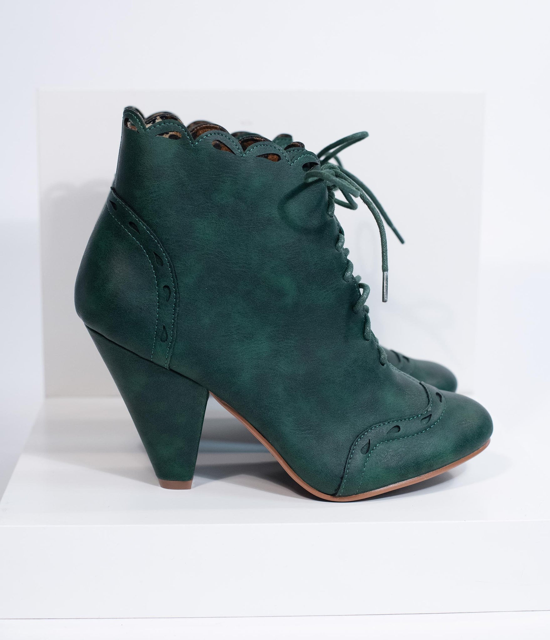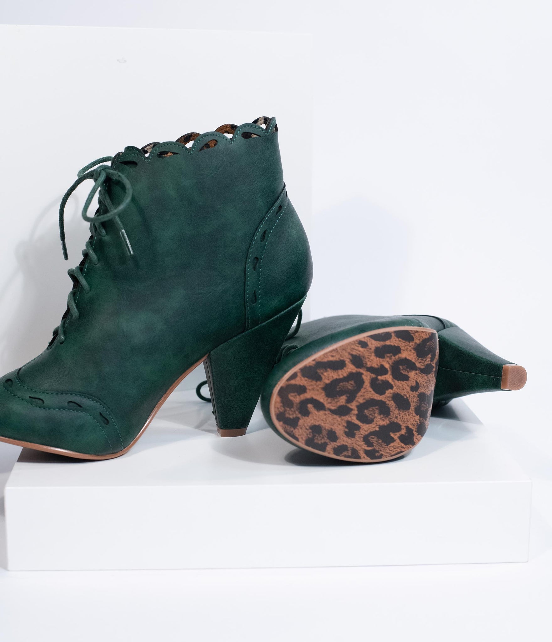 We've got butterflies, dolls! These whimsical booties from Bettie Page are crafted in emerald green leatherette and feature a spectator accent on the toe and heel. Secured with a vintage styled lace up front and outfitted with a dramatic 4” lift, the soft cushion insole and polka dot interior turn this into a pair of favorites!