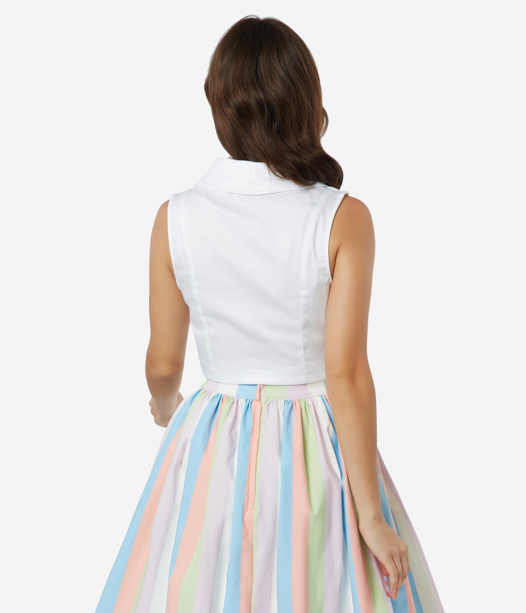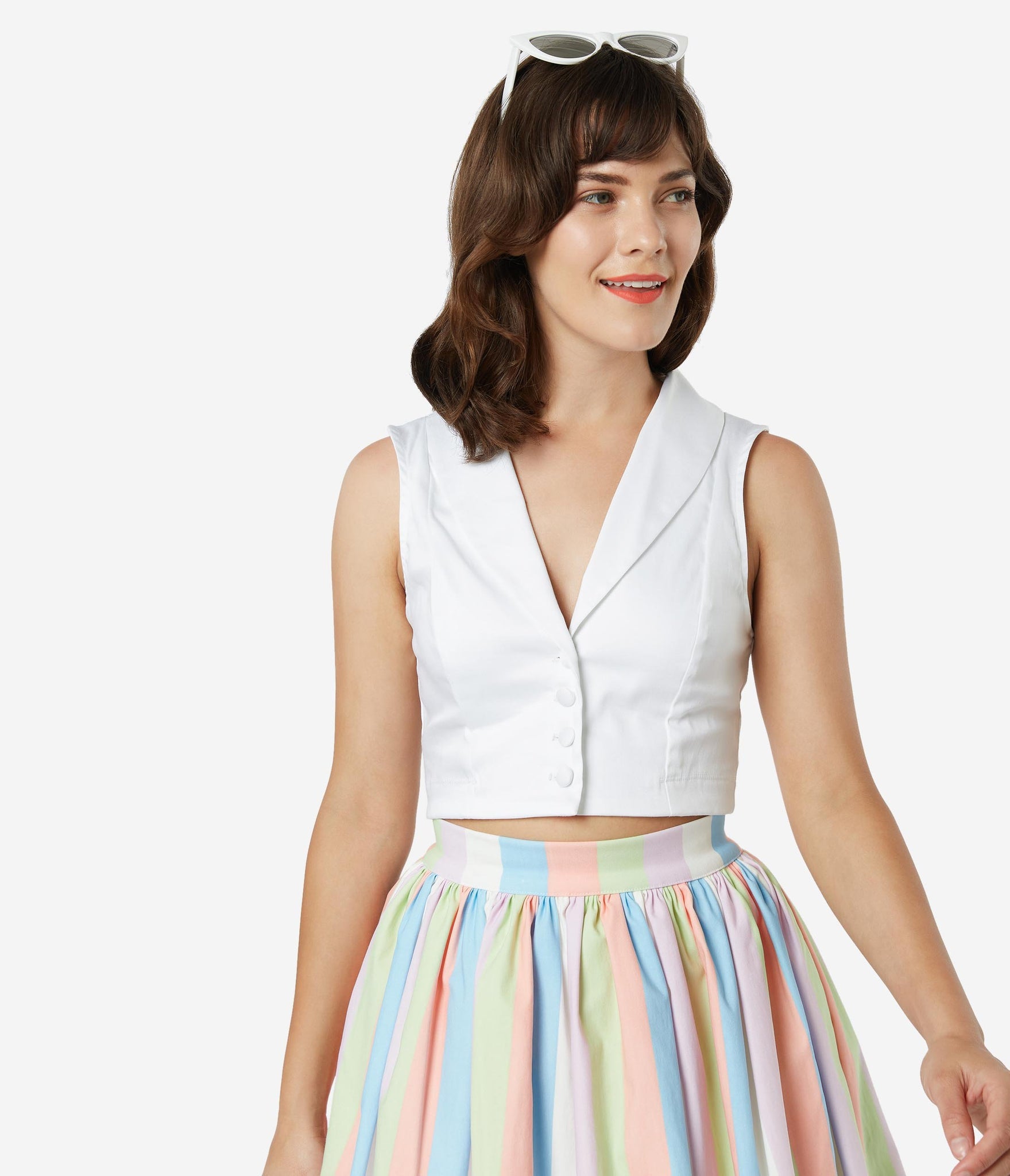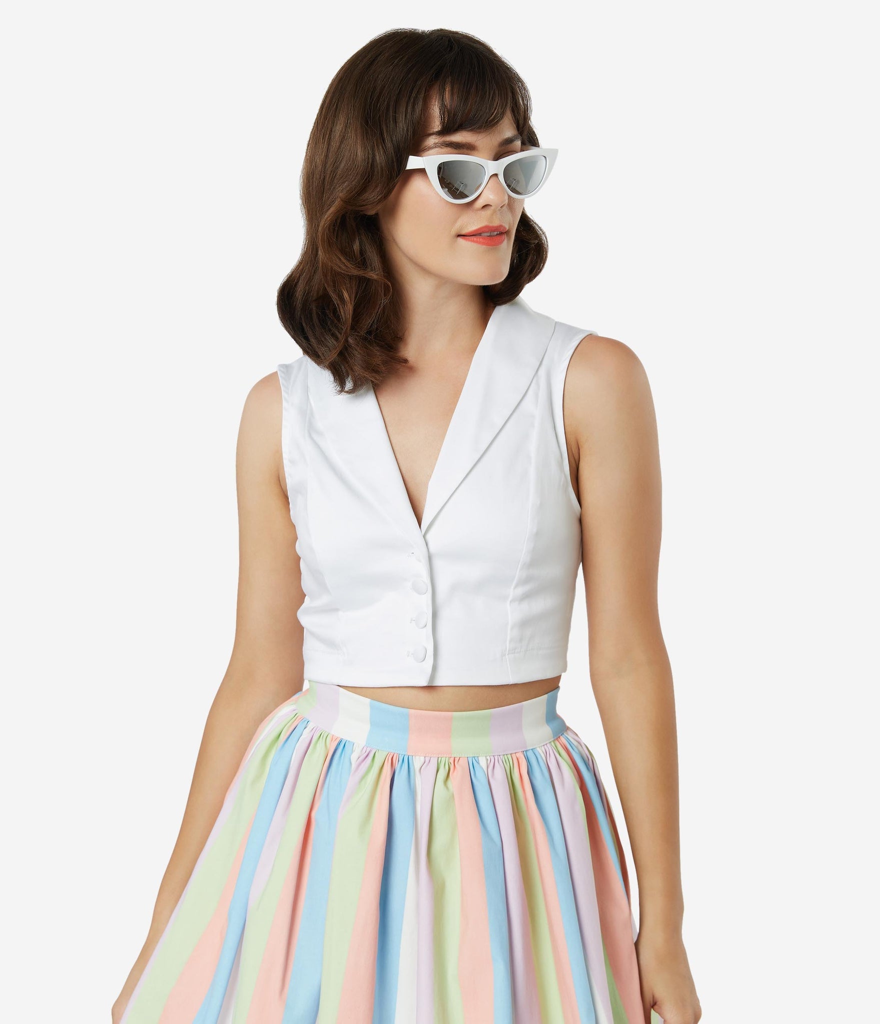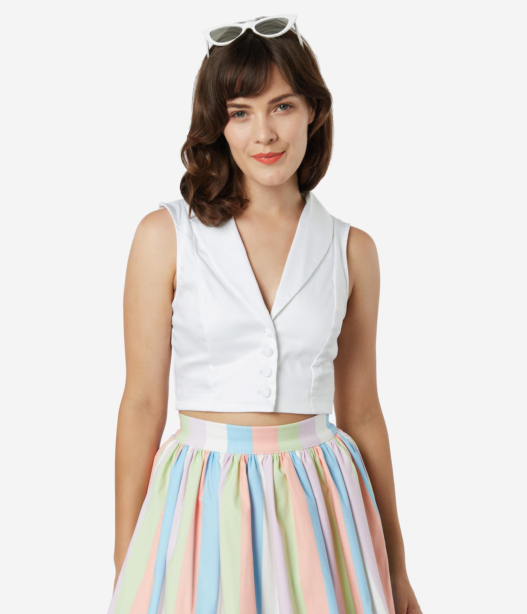 This one makes the cut, dear! A beautiful ivory white top cropped to perfection from Bettie Page and crafted in a lightweight cotton. The button up front leads to a sultry V-neckline, embellished with a classic lapel and striking with a fabulous sleeveless design. Add retro wonder to to your wardrobe essentials!