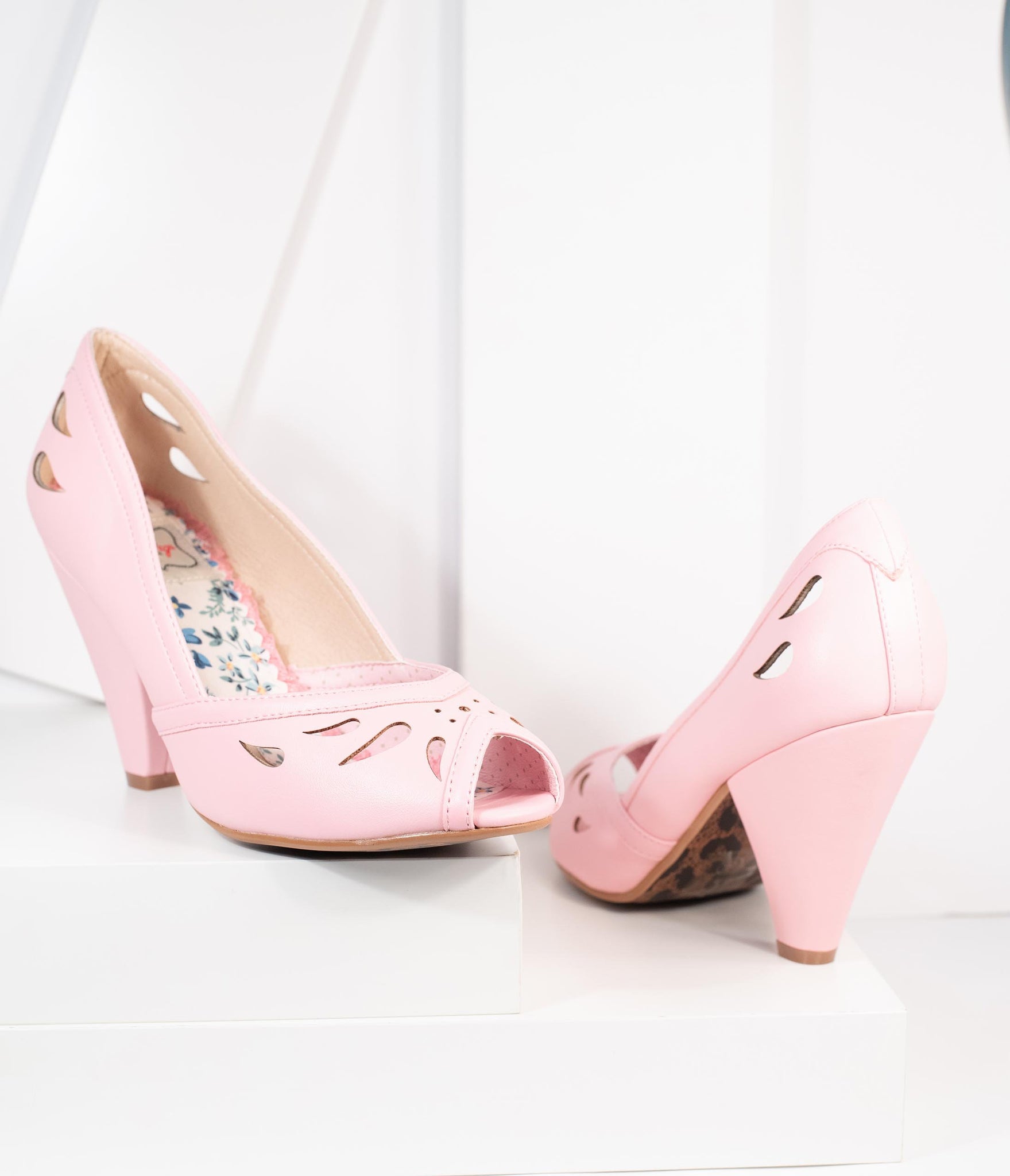 There’s nothing sweeter! These cute pumps from Bettie Page are crafted in a fabulous light pink leatherette and boast charming cutouts throughout. The charming peep toe and stunning 4 inch heel provide perfect pin-up poise while the cushion insole lends comfort day or night!