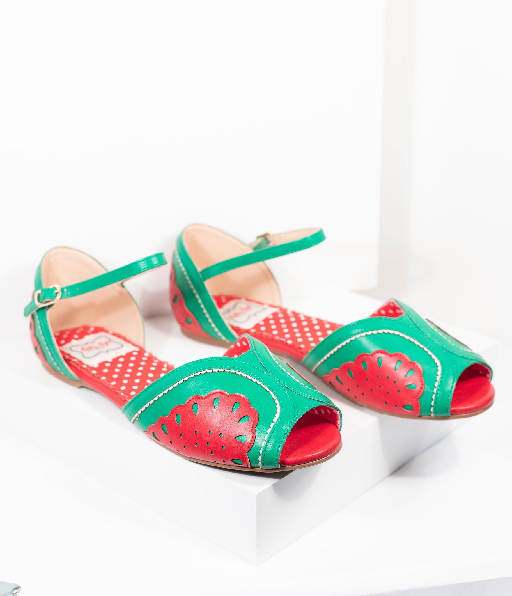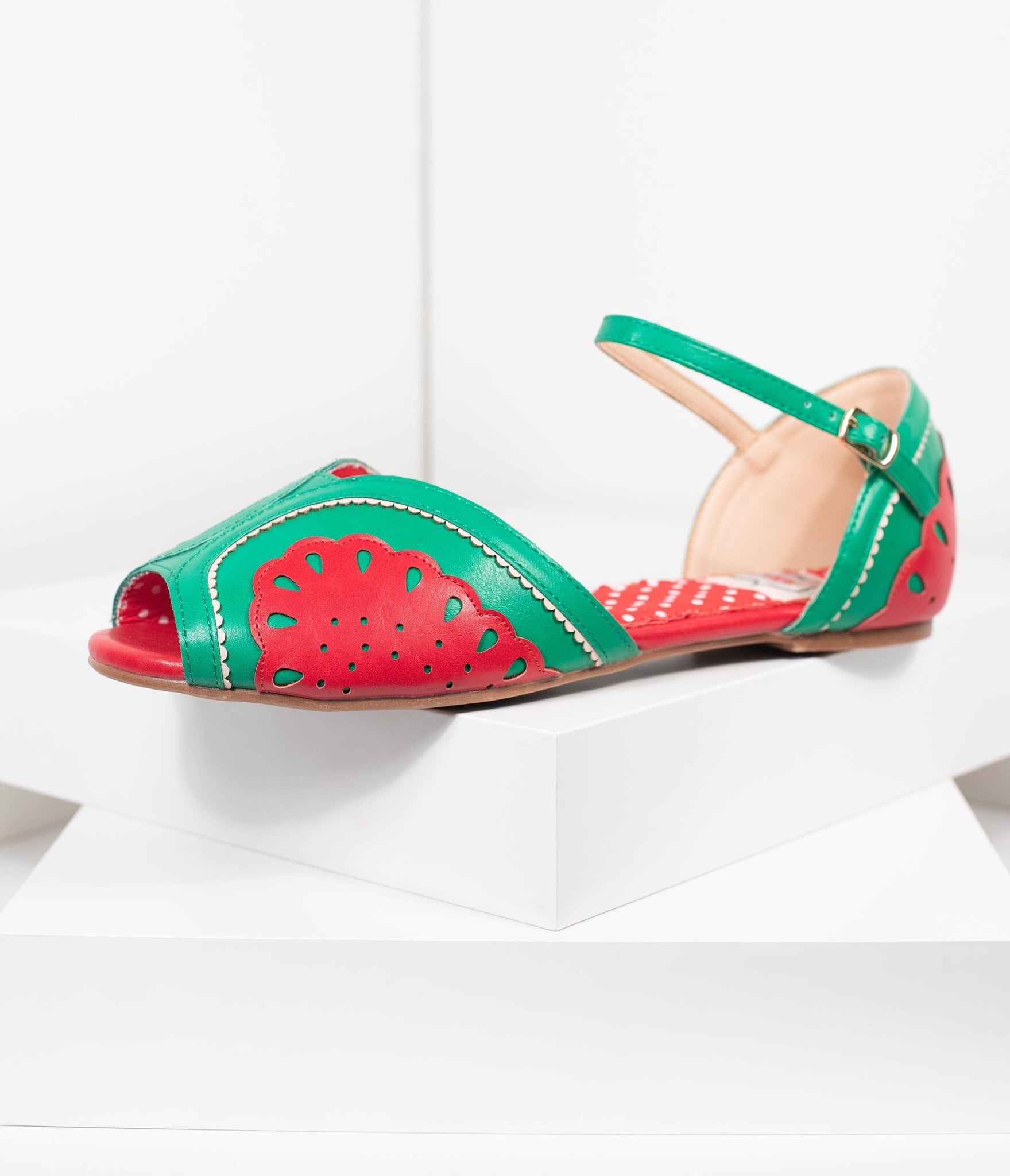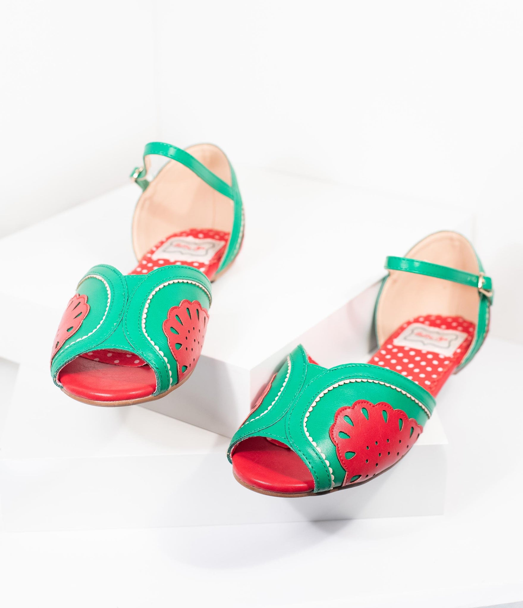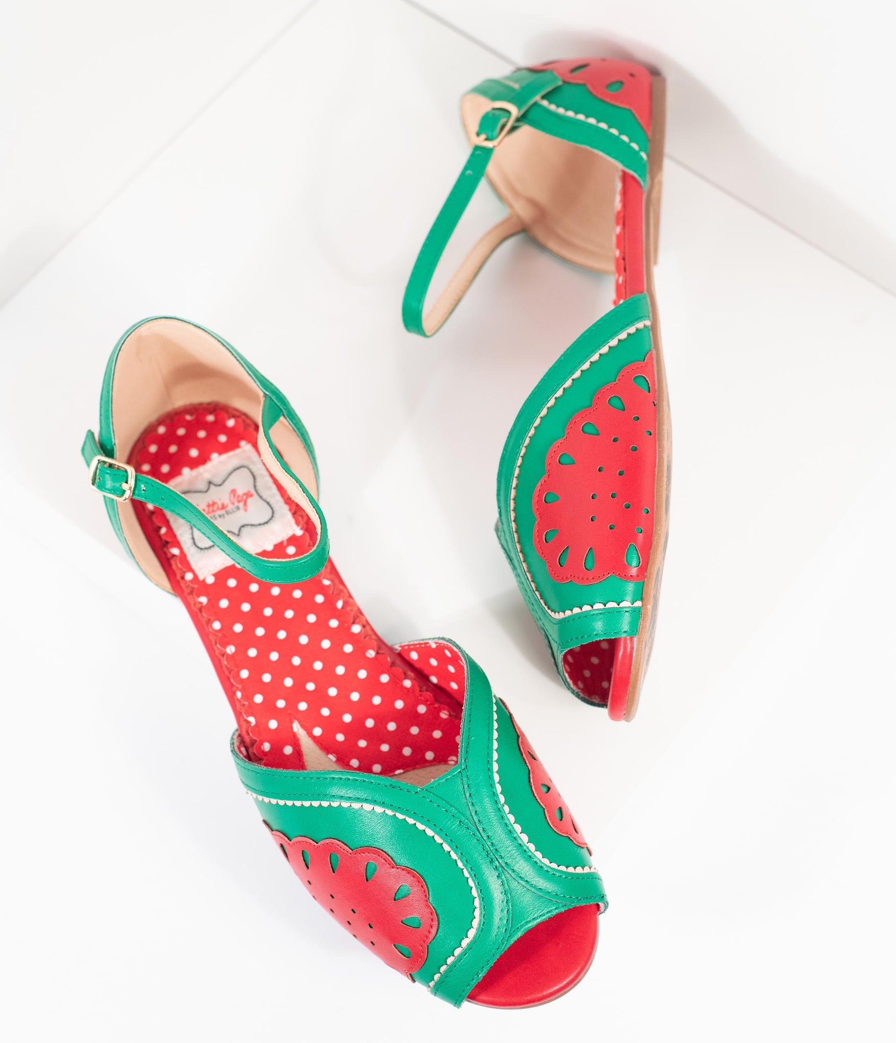 These shoes are one in a melon, darling! Fresh and juicy from Bettie Page, these Fruitie Watermelon Sandals will have you singing Tutti Frutti all summer long! Crafted in gorgeous red and green leatherette with ivory scalloped trim, flirty ankle straps complete these sandals. Insoles and red polka dot lining come together to form a comfortable and flattering pair of flawless flats you won't want to take off!