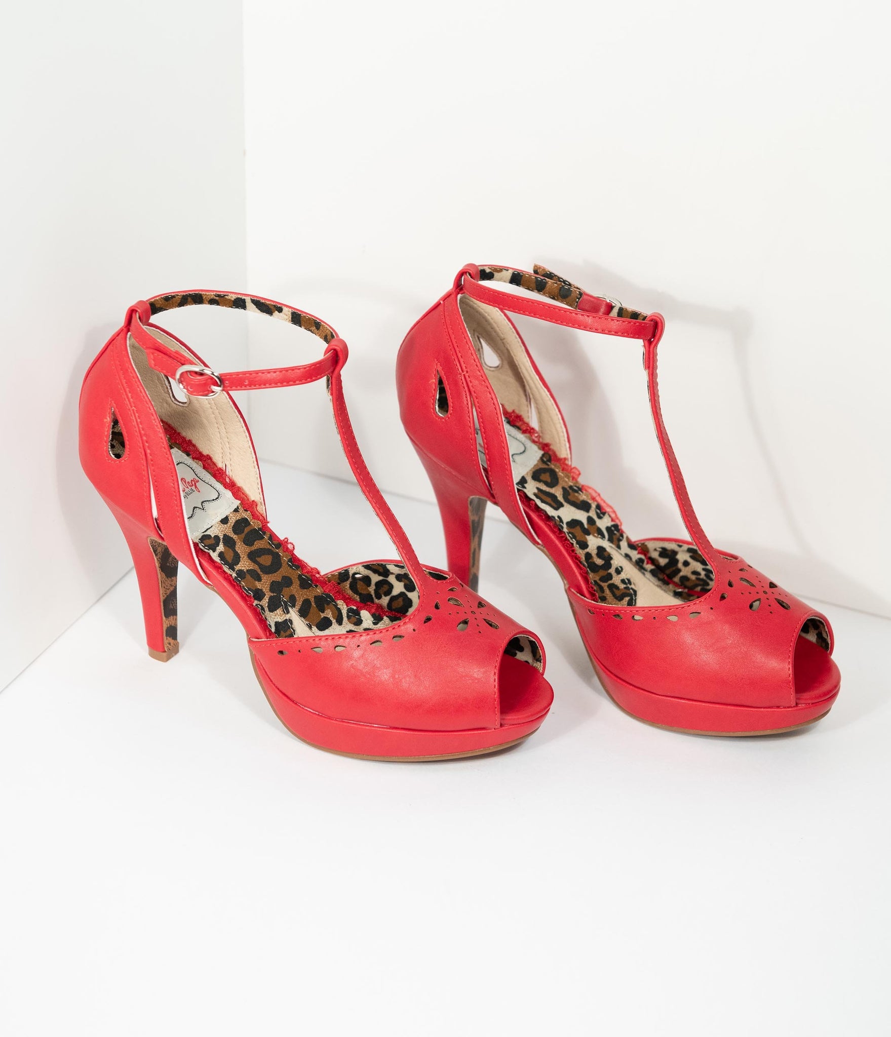 Fearless flirtation! Crafted in a fabulous leatherette, the Willie heels are a delightful pair of t-straps in a sultry red. The adorable peep toe vamp is embellished with sweet laser cutout detail while the vintage t-strap design is secured with a gored and adjustable buckle ankle strap. Complete with leopard print cushion insole and minimal tread, take a confident stroll!