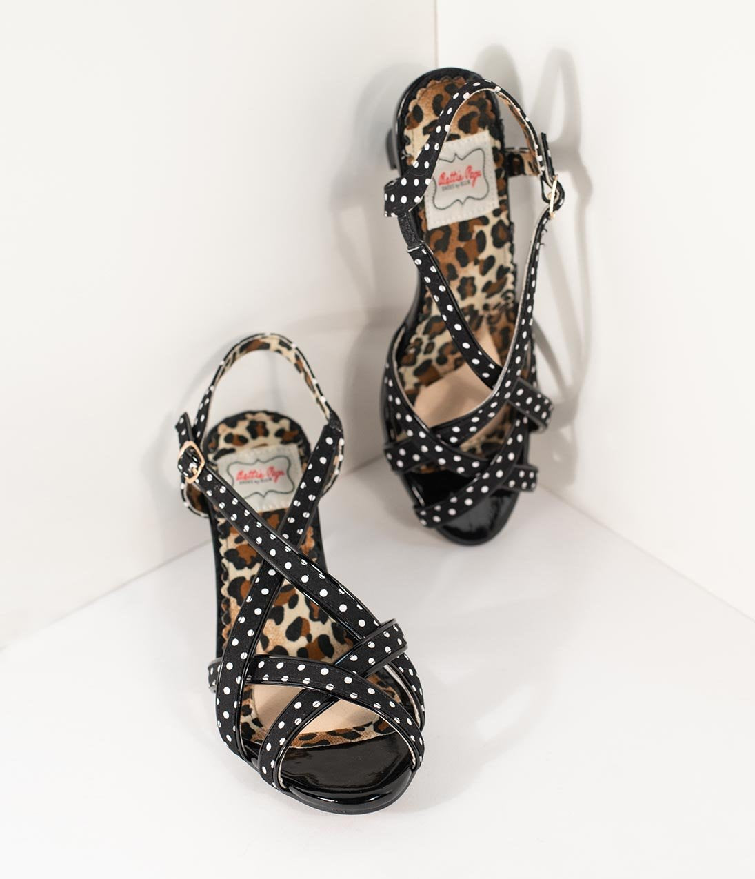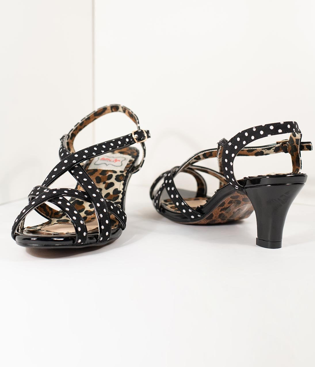 Take a tantalizing step towards the dotted side, darling! The Gracie heels are a retro revolution in adorable black and dance with white polka dots. Crafted from a lovely textile and patent leatherette, a striking design of criss crossing straps, these dainty peep toe kicks are secured with gored and adjustable ankle strap while the darling 3” heel provides a flattering lift. Outfitted with a cushioned leopard print insole to complete any enticing ensemble!