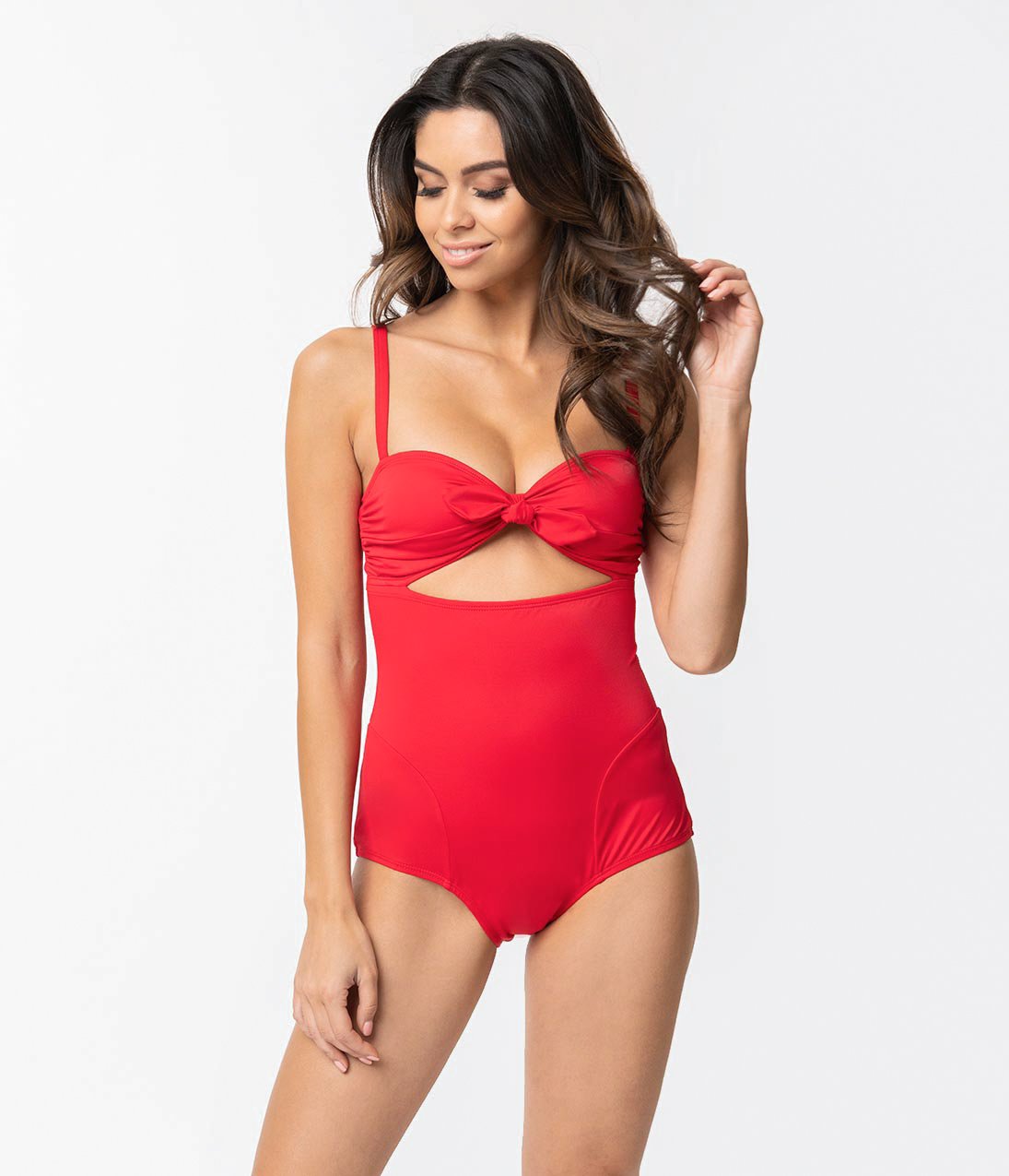 It’s a peerless pin-up look, gals! A divine retro inspired one piece swimsuit from Bettie Page in a gorgeous solid cherry red color! Entirely flattering with front power mesh lining, this striking vintage swimsuit boasts a sultry front cutout under a sweetheart neckline, centered by an adorable bow. The straps curve around to the back and secure with a hook while subtle padding provides comfort. With low cut legs to keep things chic, don’t forget the shades, dear.