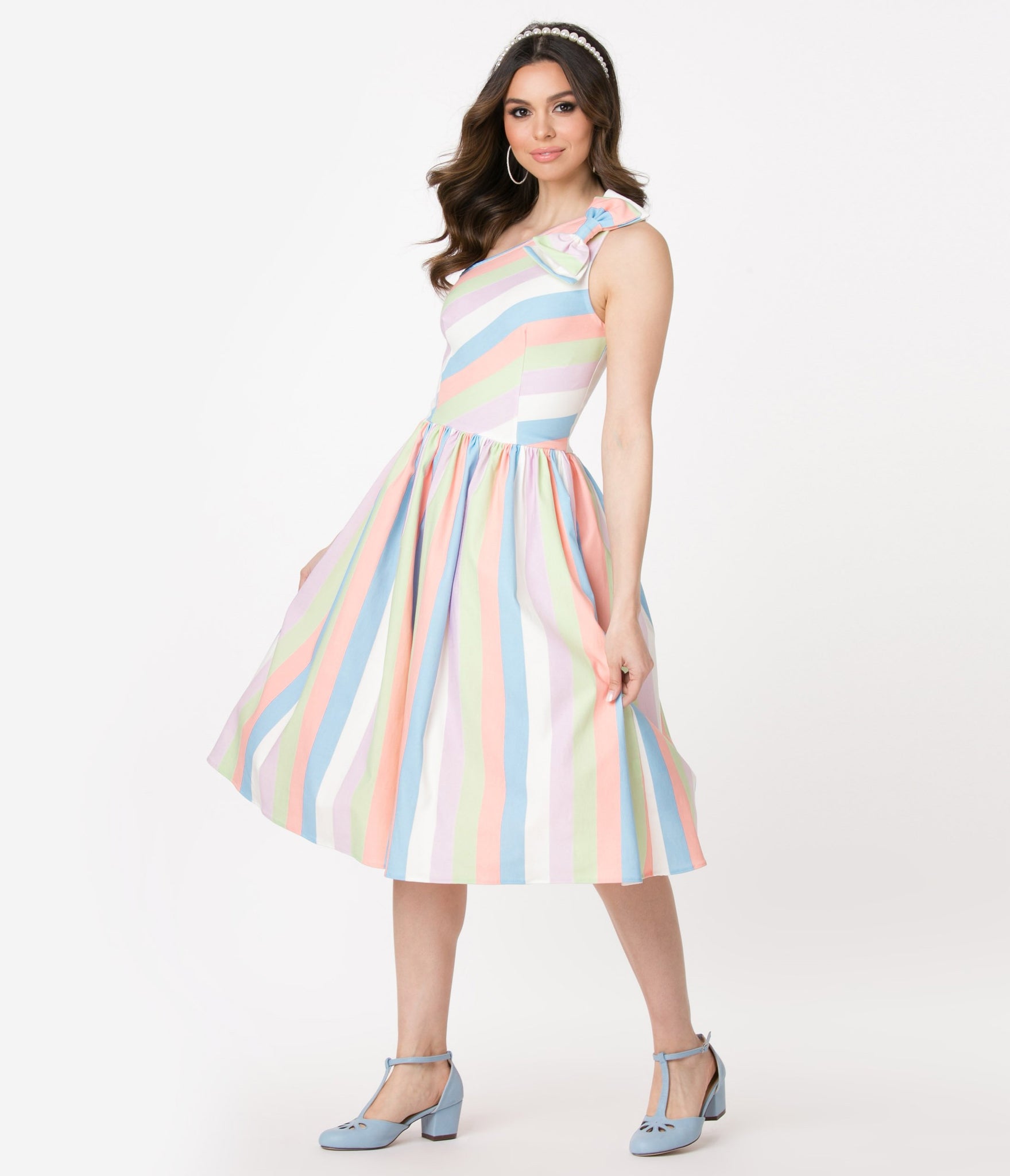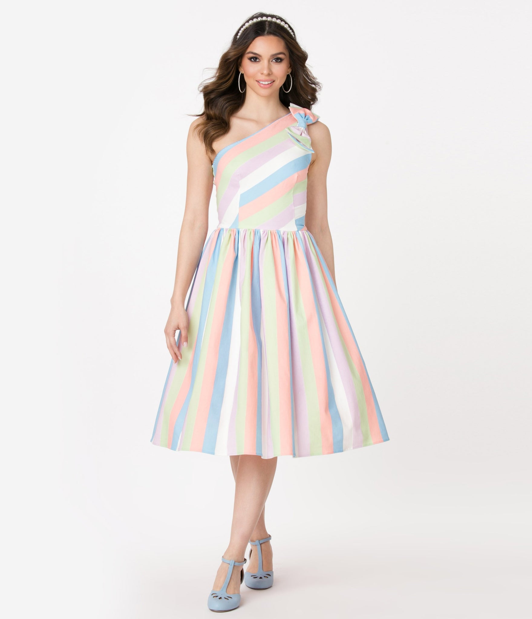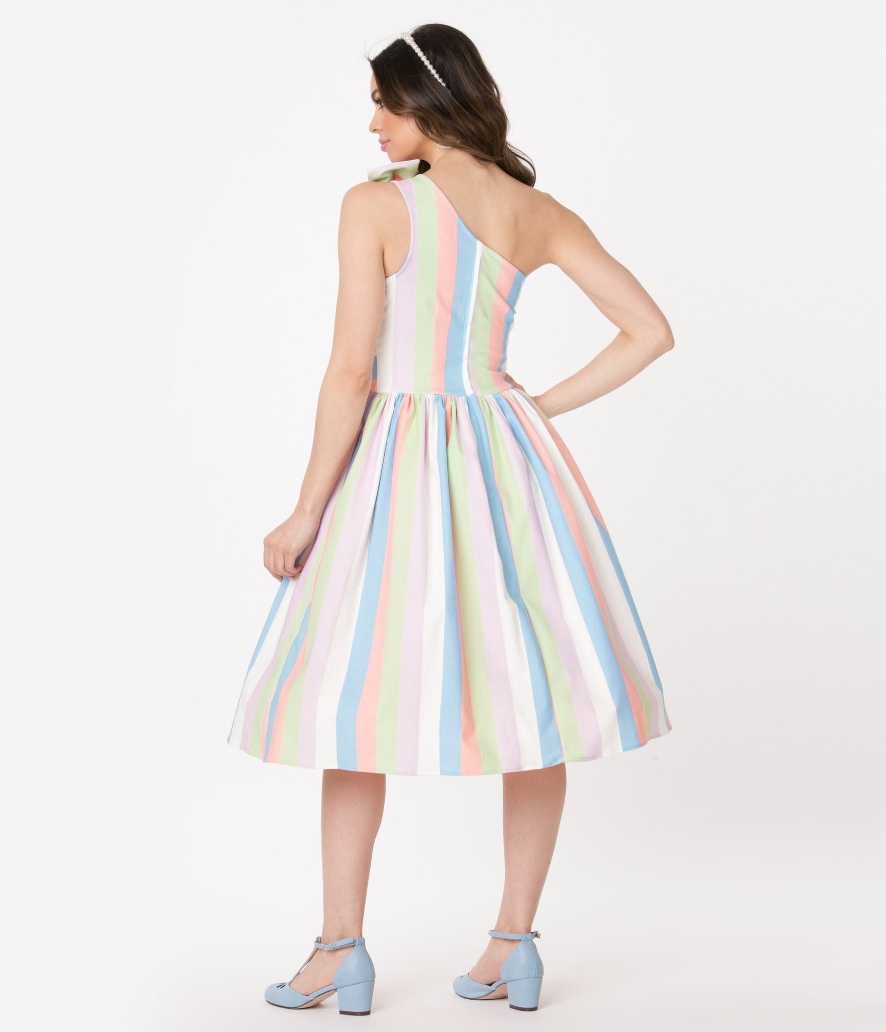 Here’s the scoop, dames! An adorable piece from Bettie Page, the Belinda Dress is a mid-century wonder, crafted in a sensational sturdy stretch blend while a radiant sherbet striped pattern dashes through your form in white, blue, pink, green, and purple. The darted bodice boasts a sultry one shoulder design while a charming bow brooch can be pinned anywhere you’d like. The marvelous swing skirt gathers at the seamed waist and cascades to your knees while side pockets lend modern function. Outfitted with a mid back zipper to nip in your figure, be bold and bright!