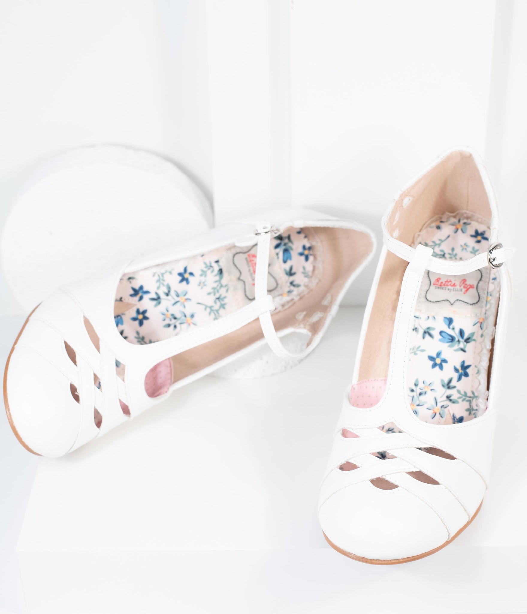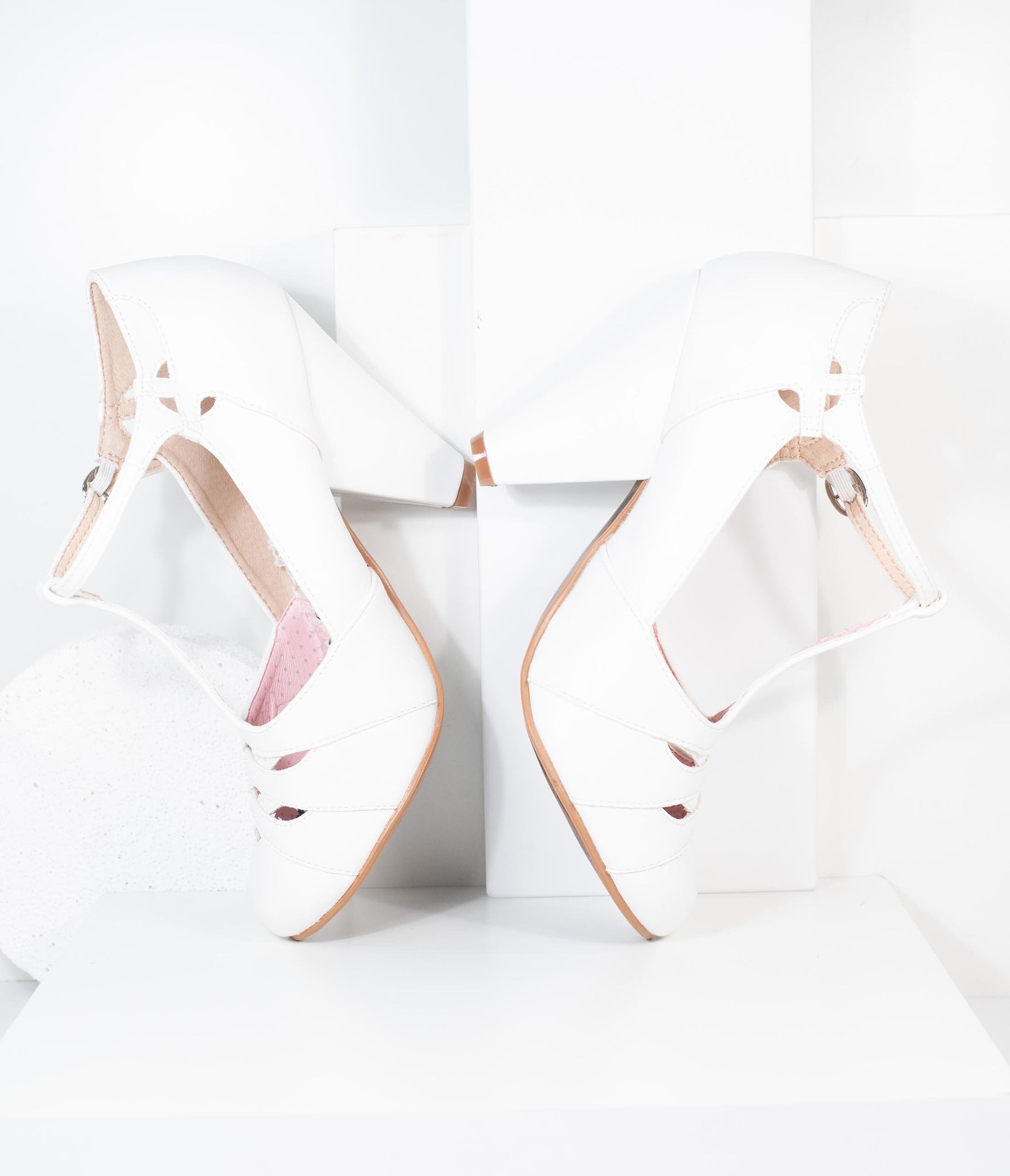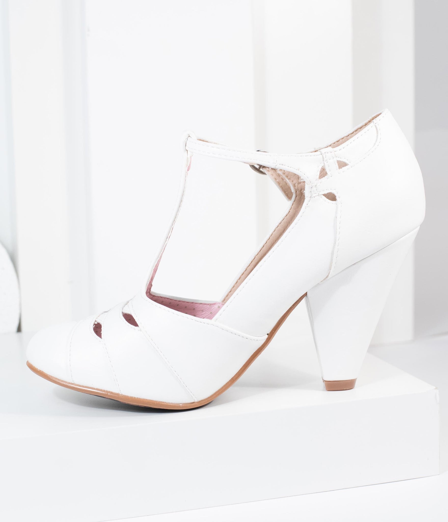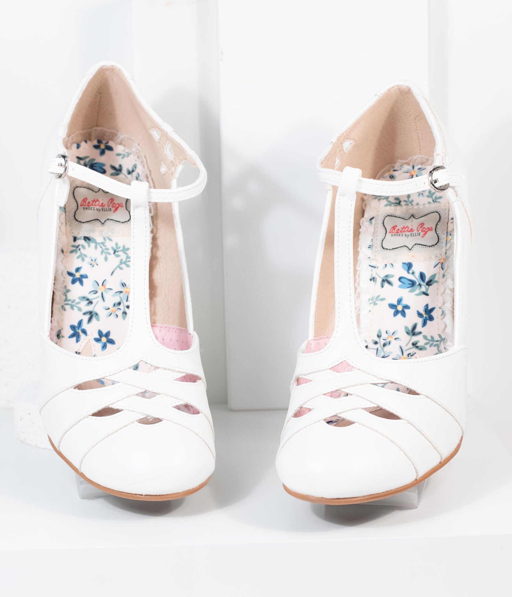 Charmingly cute and endlessly endearing, the Laura Heels from Bettie Page are a delightful pair crafted in an ivory white leatherette and featuring sweet cutout detail throughout the vamp. The fabulous 4 inch cone heel and adjustable t-strap provides stunning feminine vintage style while the cushion insole keeps you comfortable.