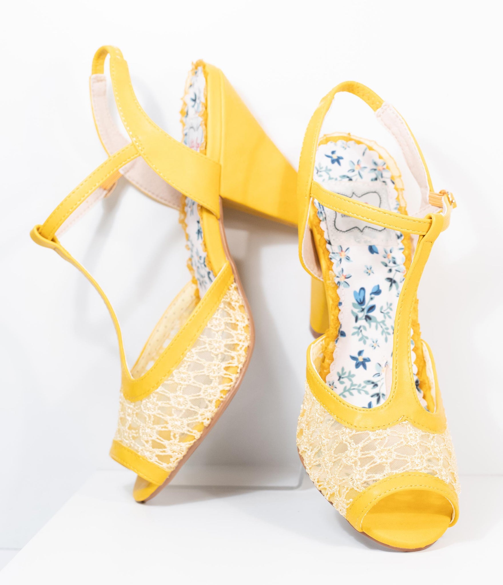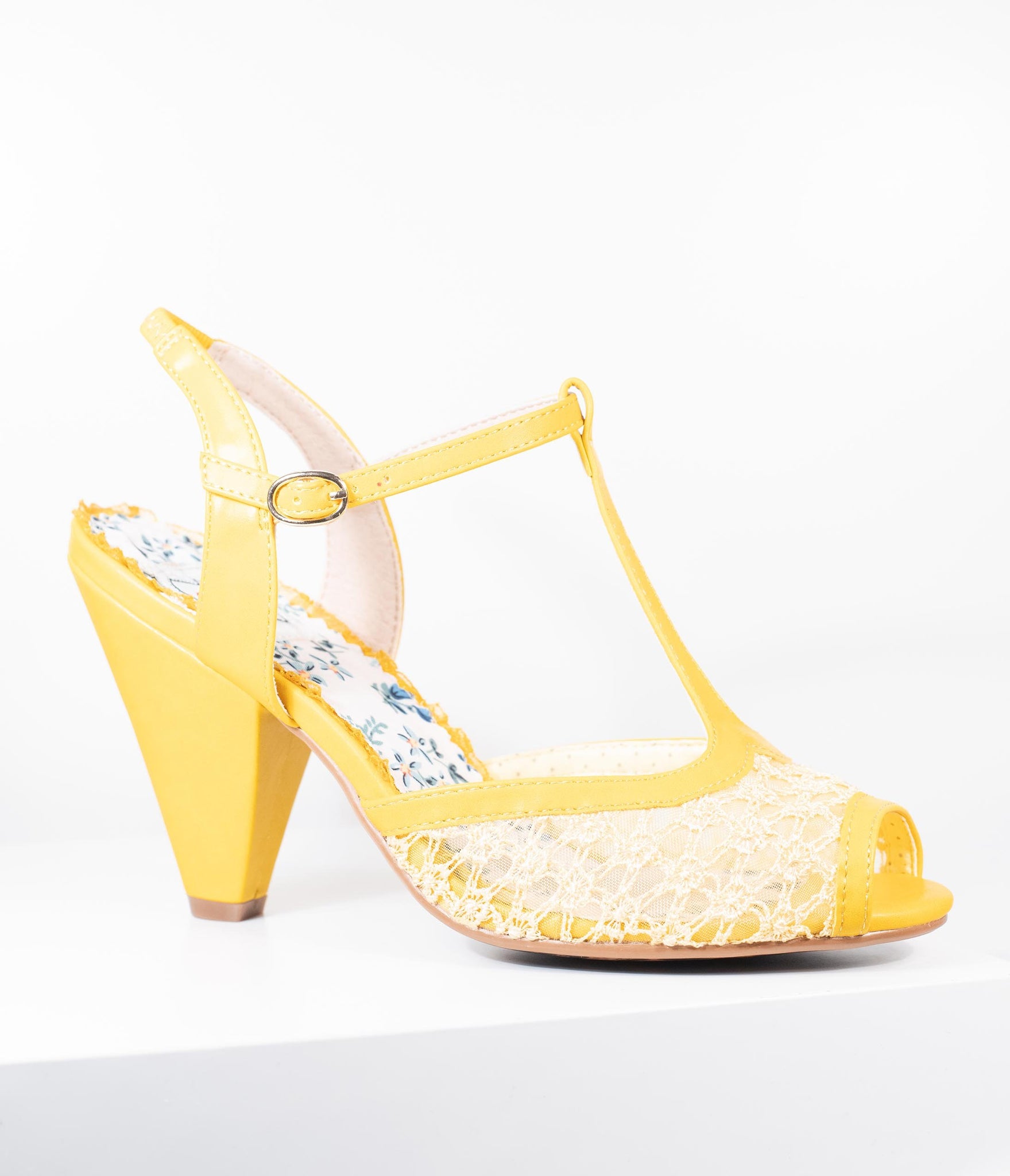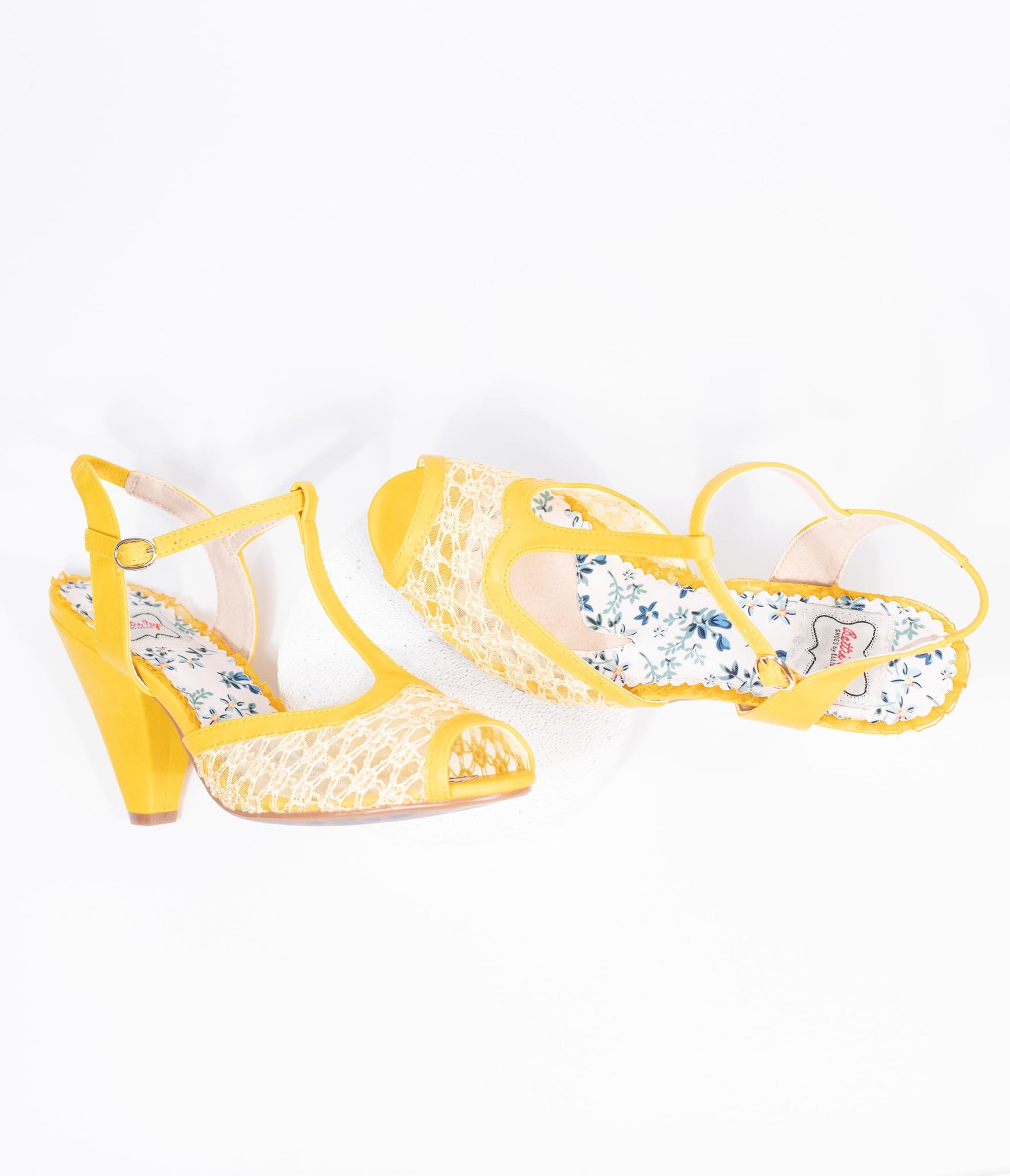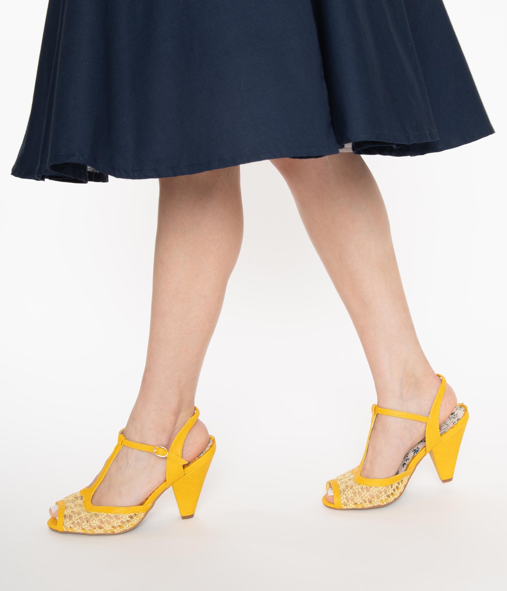 Bettie Page Yellow Lace Brooklyn T-Strap Heels