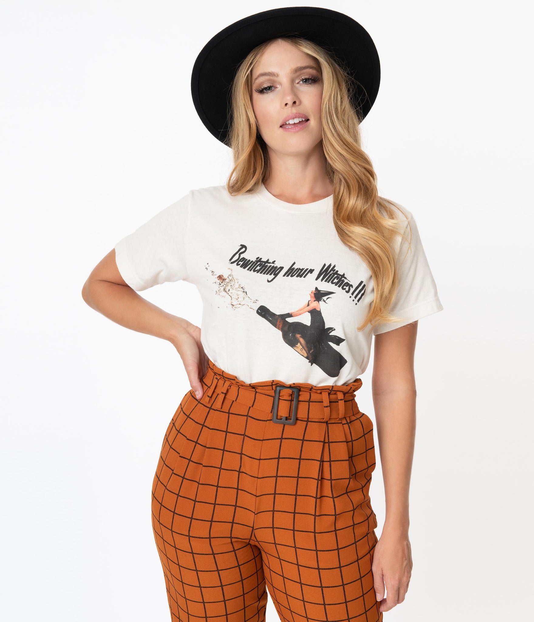 Cheers, witches! Crafted in a marvelous lightweight cotton, this creamy unisex tee features a vintage screen print of a witch on her favorite bottle of champagne with the words, ‘Bewitching Hour Witches!!!’ The casual unisex fit is complete with a crew neckline, long torso, and short sleeves.