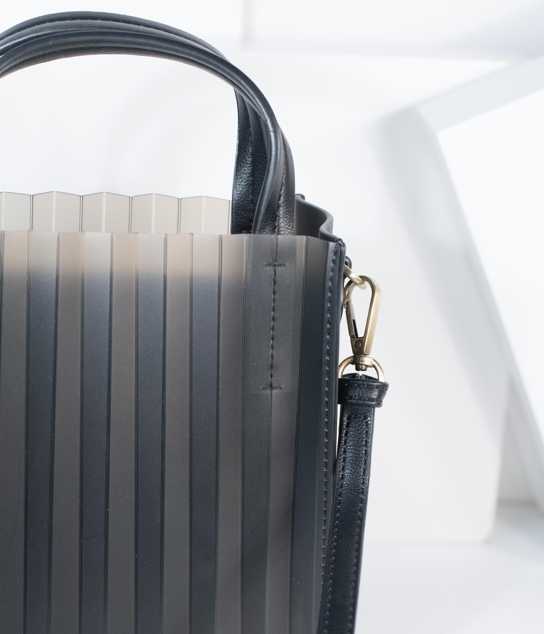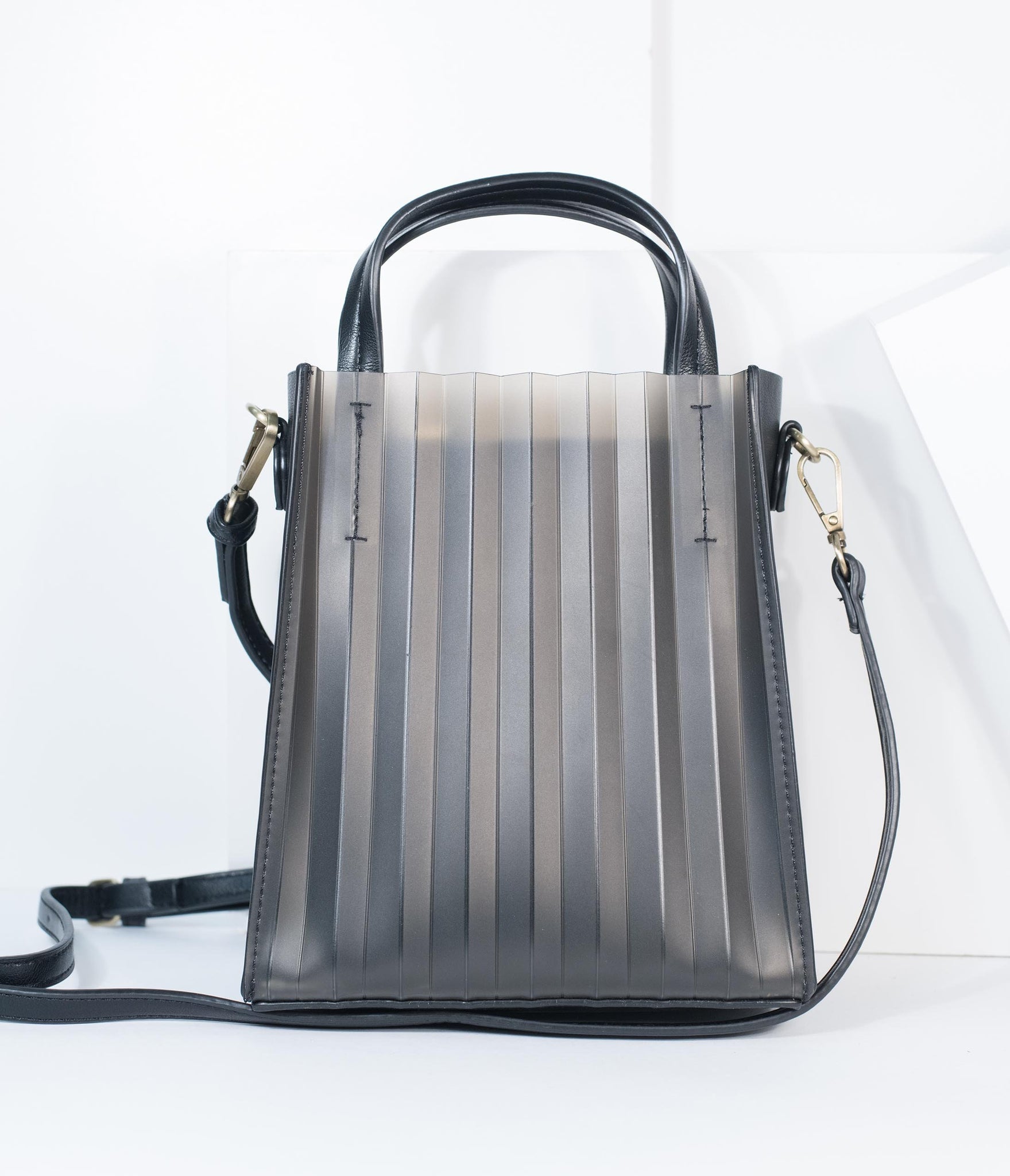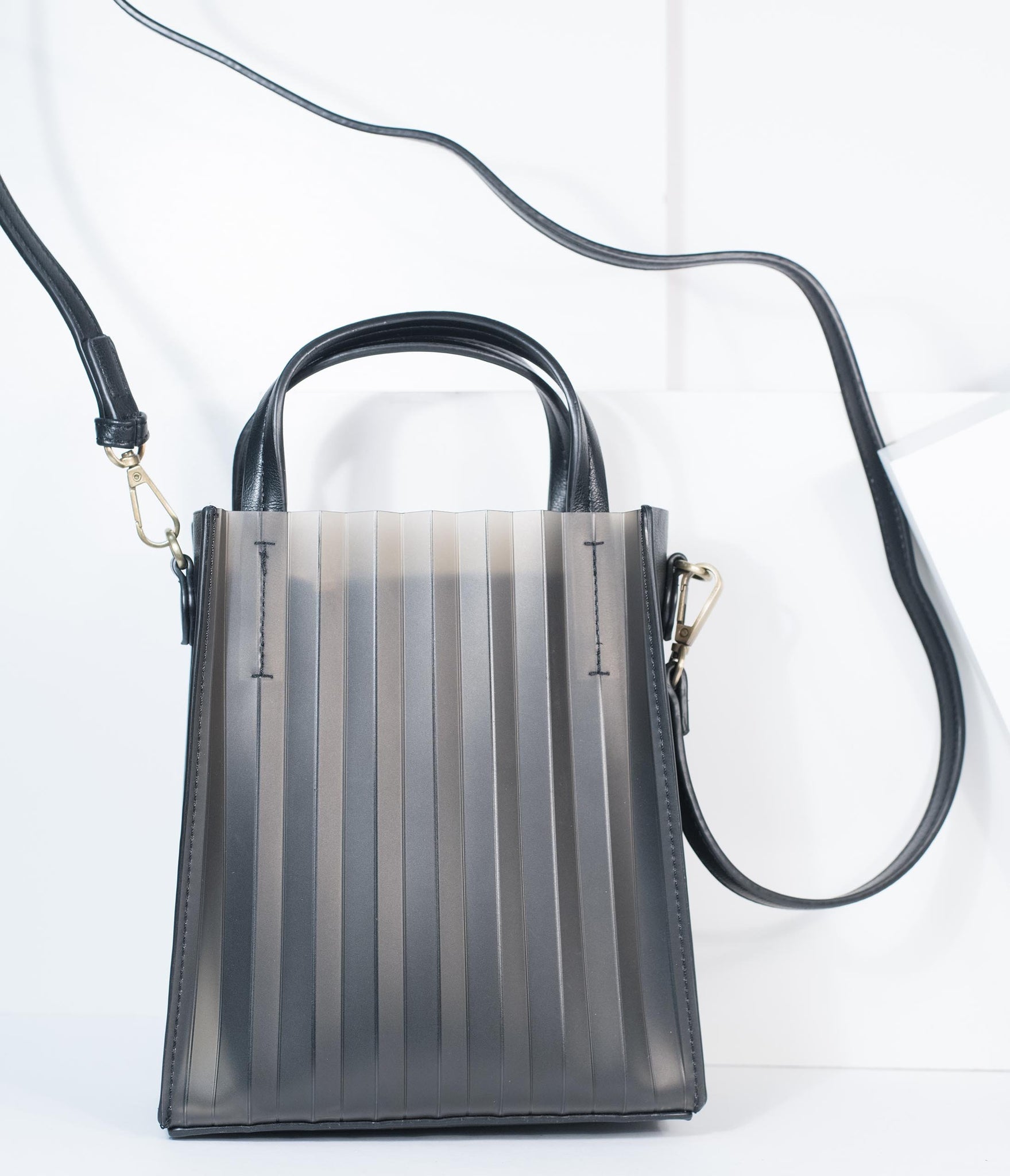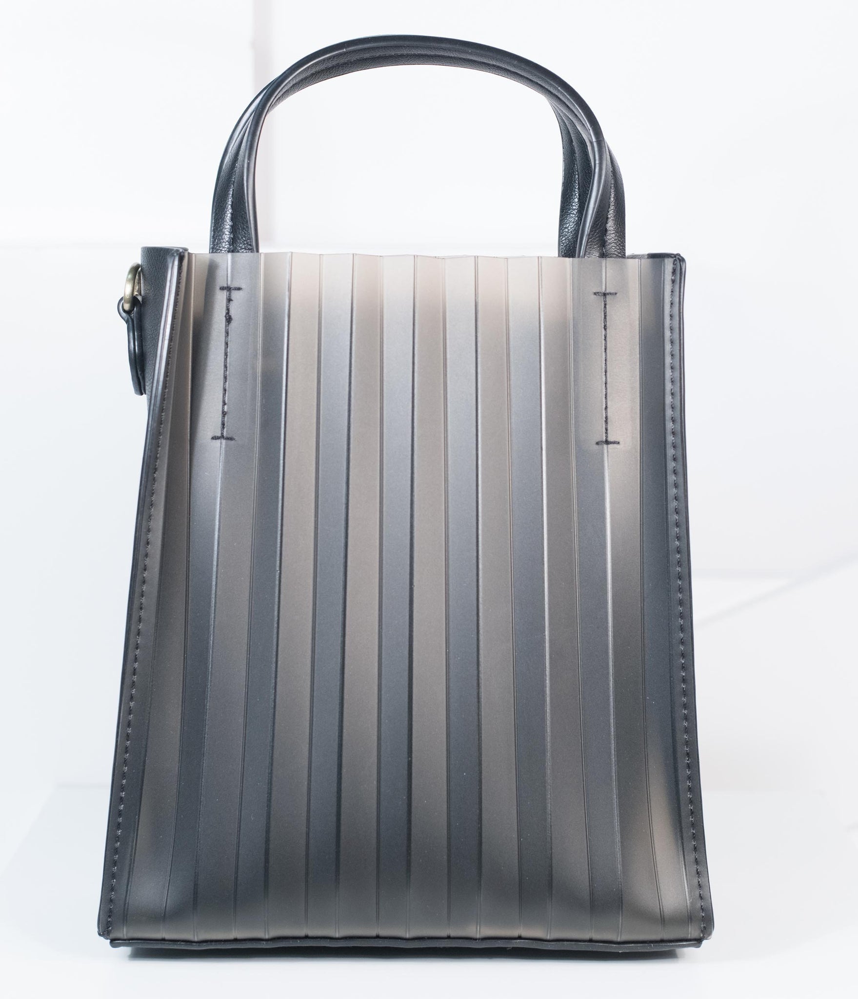 A charming cohort! This unique handbag is crafted in a fabulous black frosted jelly with an accordion texture throughout. The dual top handles and removable and adjustable shoulder strap allows for versatile carry while two slip pockets are centered by a top zippered fabric interior.