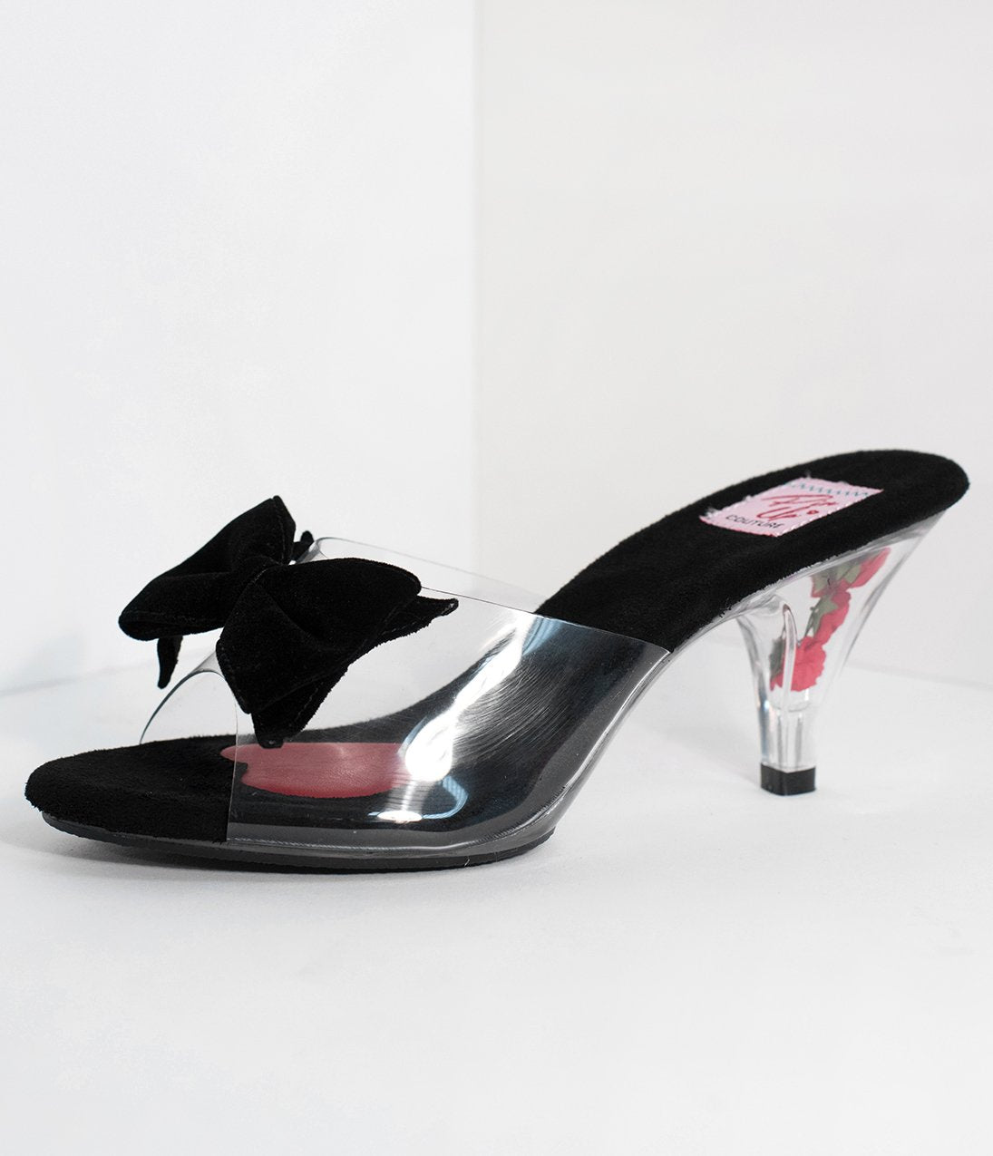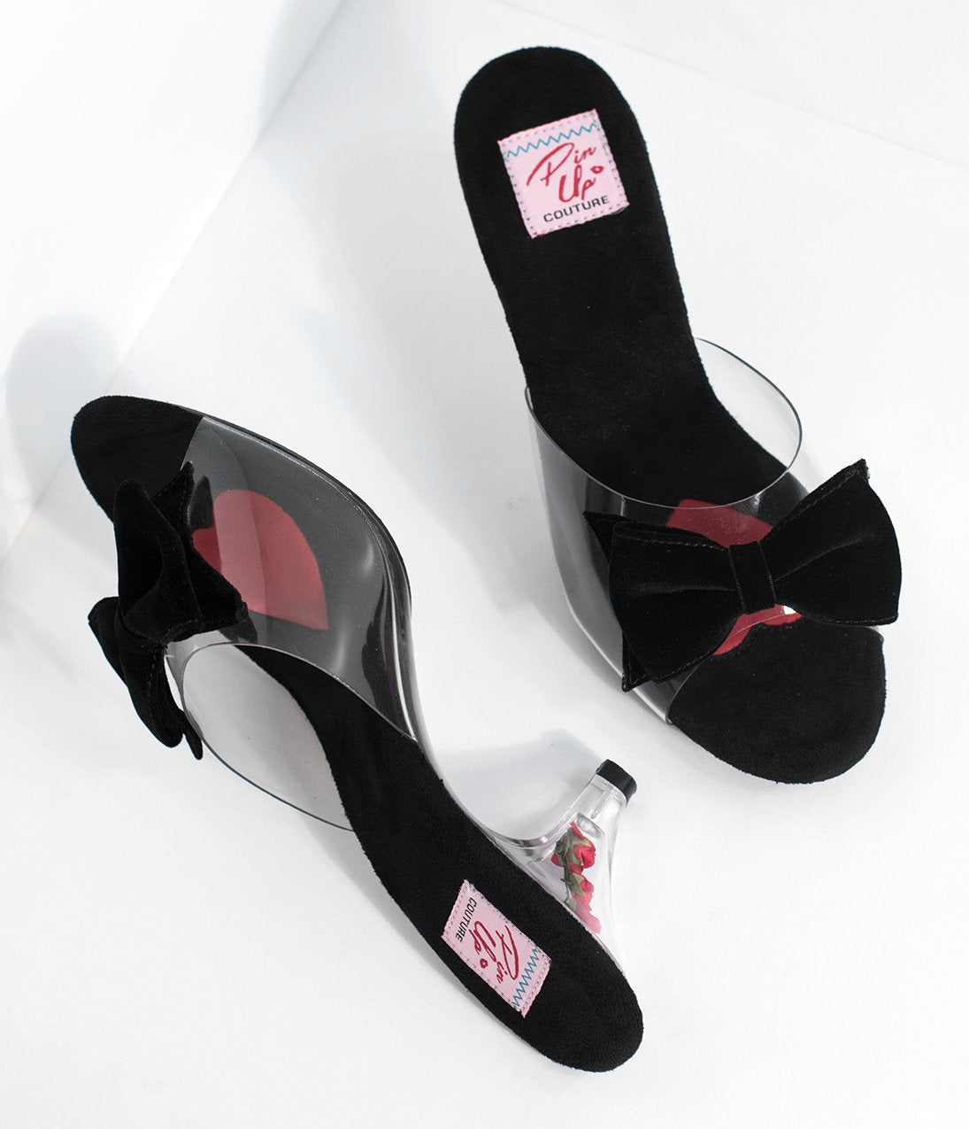 Romantically refined! Crafted in a fabulous see-through PVC, these gorgeous heels are a pleasing pair of pumps. With a flirty open toe, an elegant velvet bow sits on the vamp while the clear 3âin. heel boasts beautiful red roses suspended within.