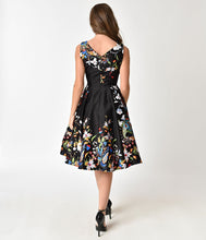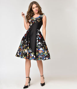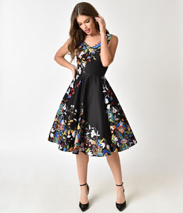 Crafted from a comfortable cotton blend and printed with a vibrant floral border, this sleeveless swing dress is 1950s inspired perfection! The cinched waistline design features gathering to provide you with a dreamy hourglass shape that is enhanced by the darting along the bodice. The V neckline matches the back line and leads to a hidden black back zipper. Deep side pockets lay flat, not matter how full they get, to keep from ruining the look of this vintage frock!