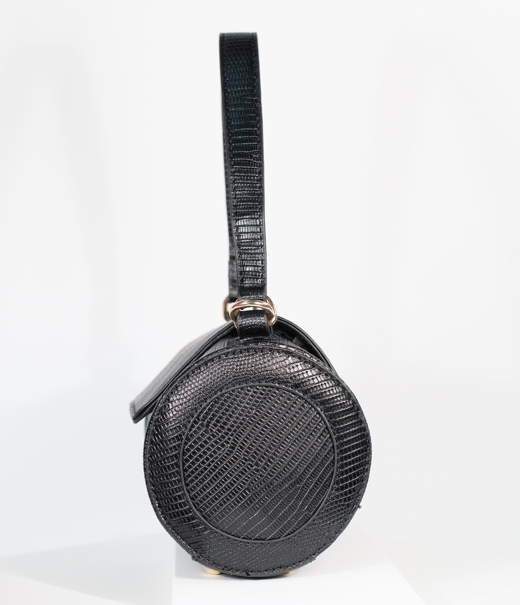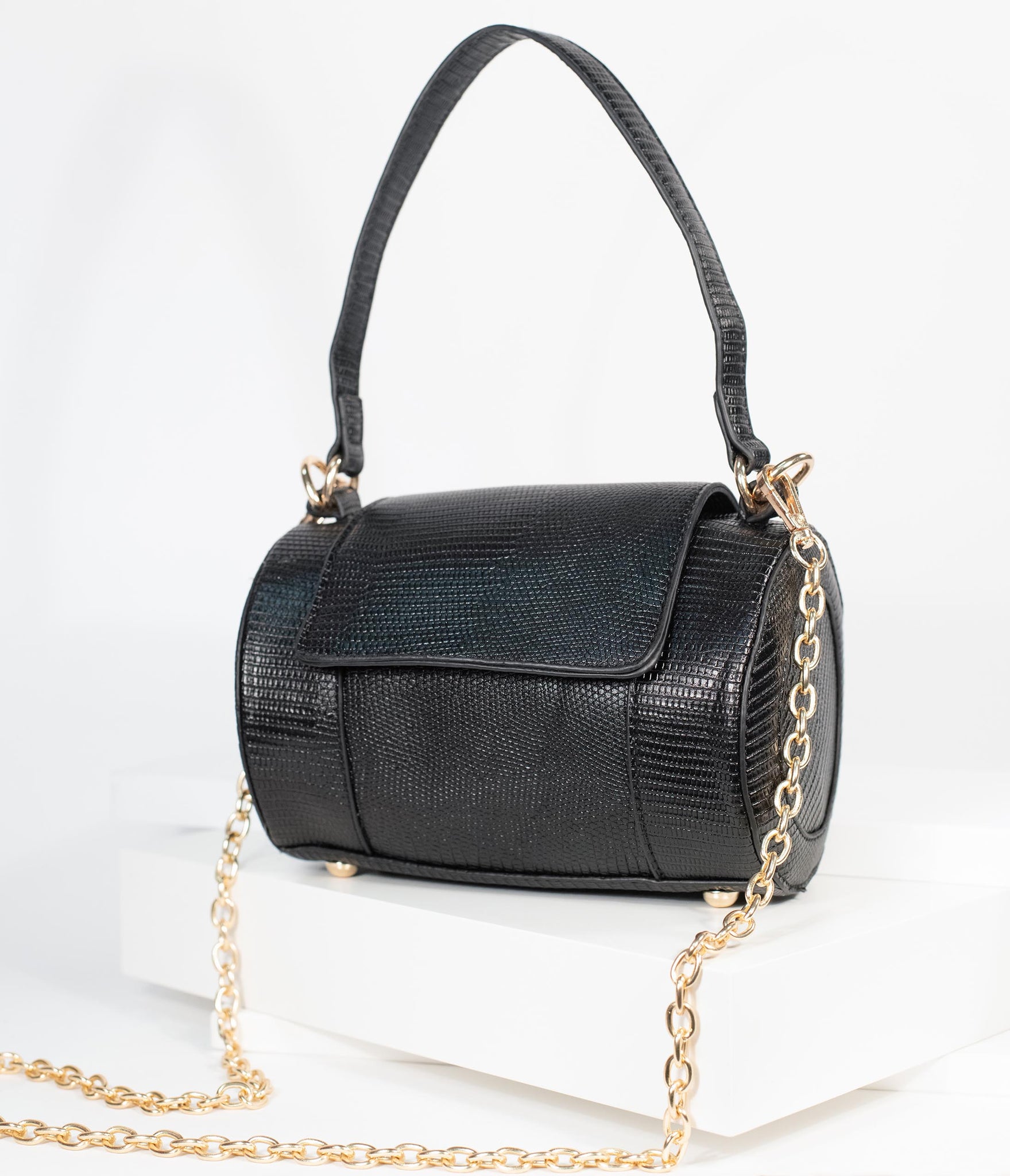 Carried away, darling! A chic black purse for making moves, this darling accessory features embossed leatherette and golden hardware for a glamorous addition to your ensemble. The barrel design features a top handle and removable golden chain shoulder strap for versatile wear. The fold over top is secured with magnetic snap buttons while studded feet provides a sturdy base. It’s unbeatable!