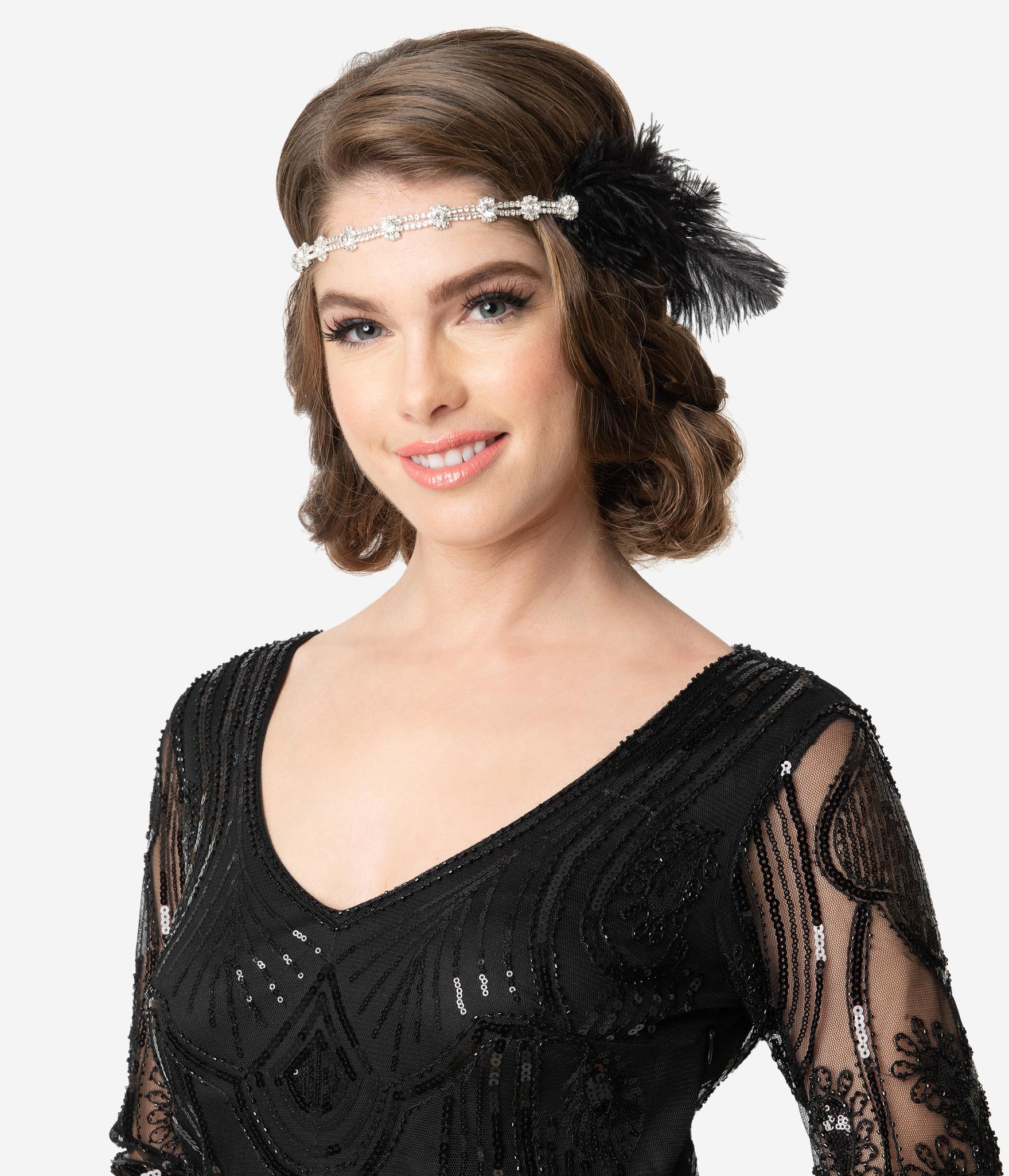 Dazzle effortlessly in Margo! The soft and stretchy black elasticized headband attaches to an opulent dose of silver rhinestones in a lovely vintage design that meets a dashing plume of a black ostrich feather on the side. The beautiful 1920s accent to your vintage silhouette!