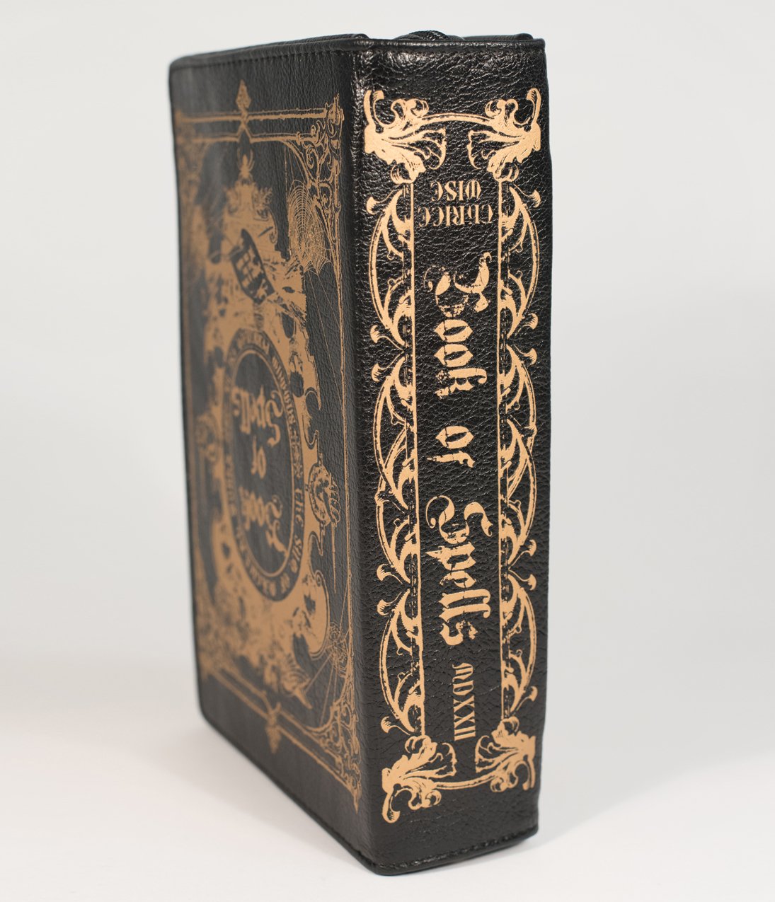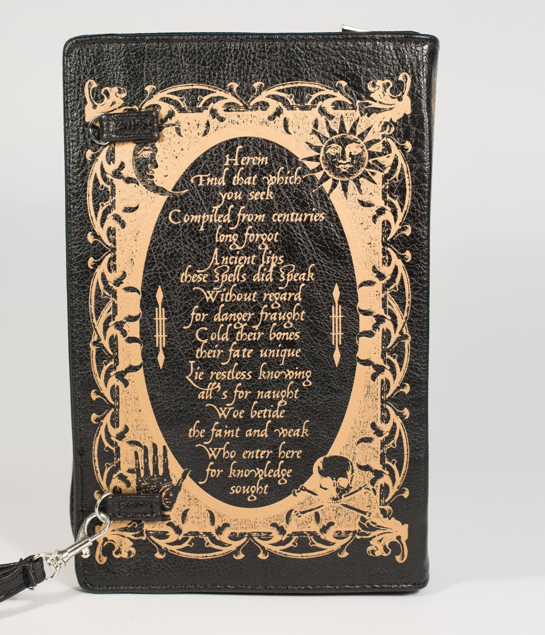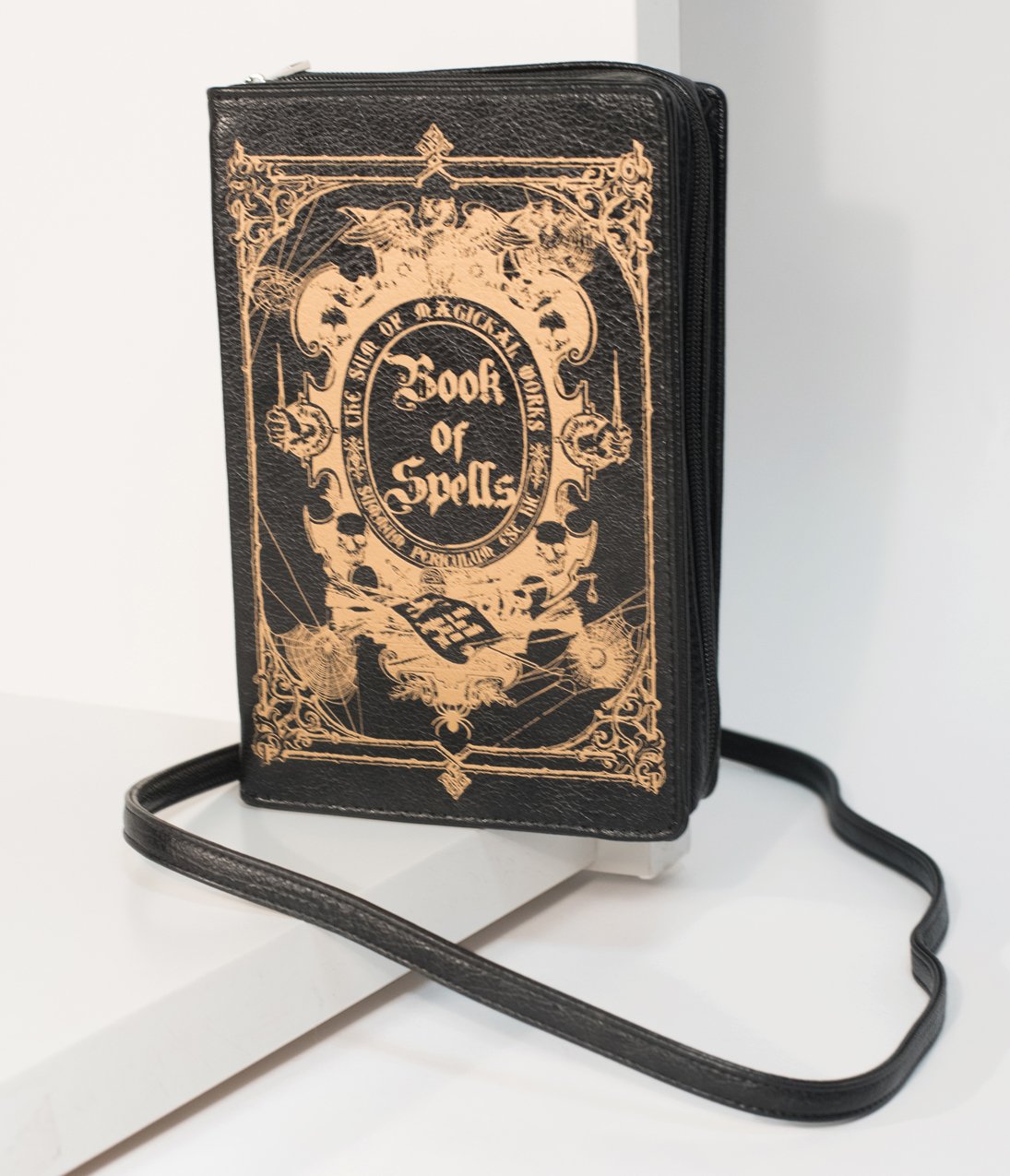 What’s your favorite spell, dear? This mysterious marvel is made for dames with a dark side. Designed as a black book with golden scrolls and “Book of Spells” lettering, this dark piece boasts spiderwebs, arcane glyphs, and ancient poems over its entirety. A zipper closure reveals an accordion fold out interior, complete with a zipper center pocket and removable cross body strap. With a leather look and a mystical feel, this beauteous book will keep all your secrets safe!