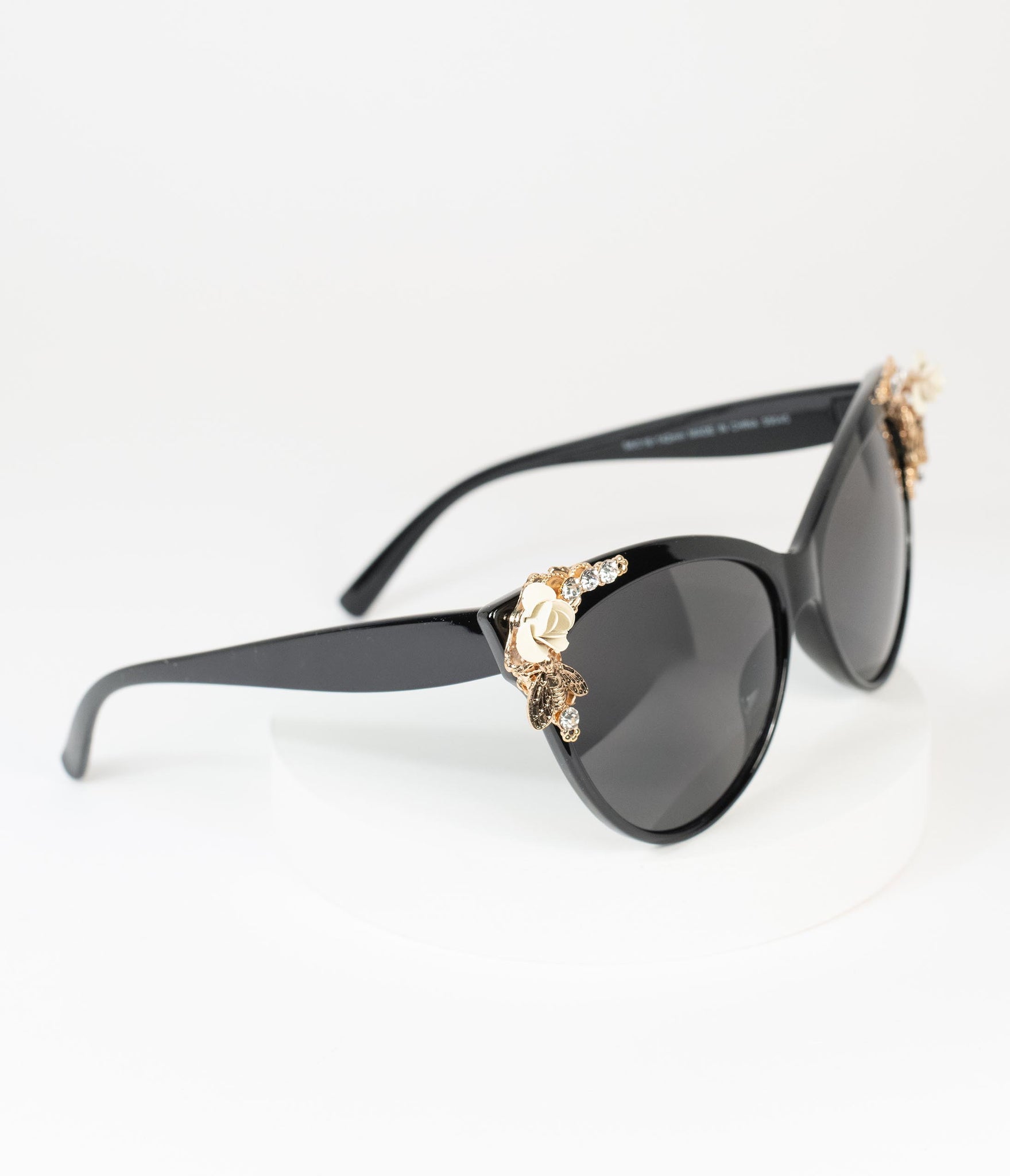 Go on and embellish a bit, darling! A glamorous pair of retro inspired sunglasses, complete in a chic black with impact resistant lenses and high quality construction. Featuring molded nose pads and slim arms with curved temple tips for a comfortable fit, elegantly adorned with crystal, rose and spring embellishment at each corner. Dark tinted UV protective lenses and a fabulous cat eye shape top off these stupefying stunners!