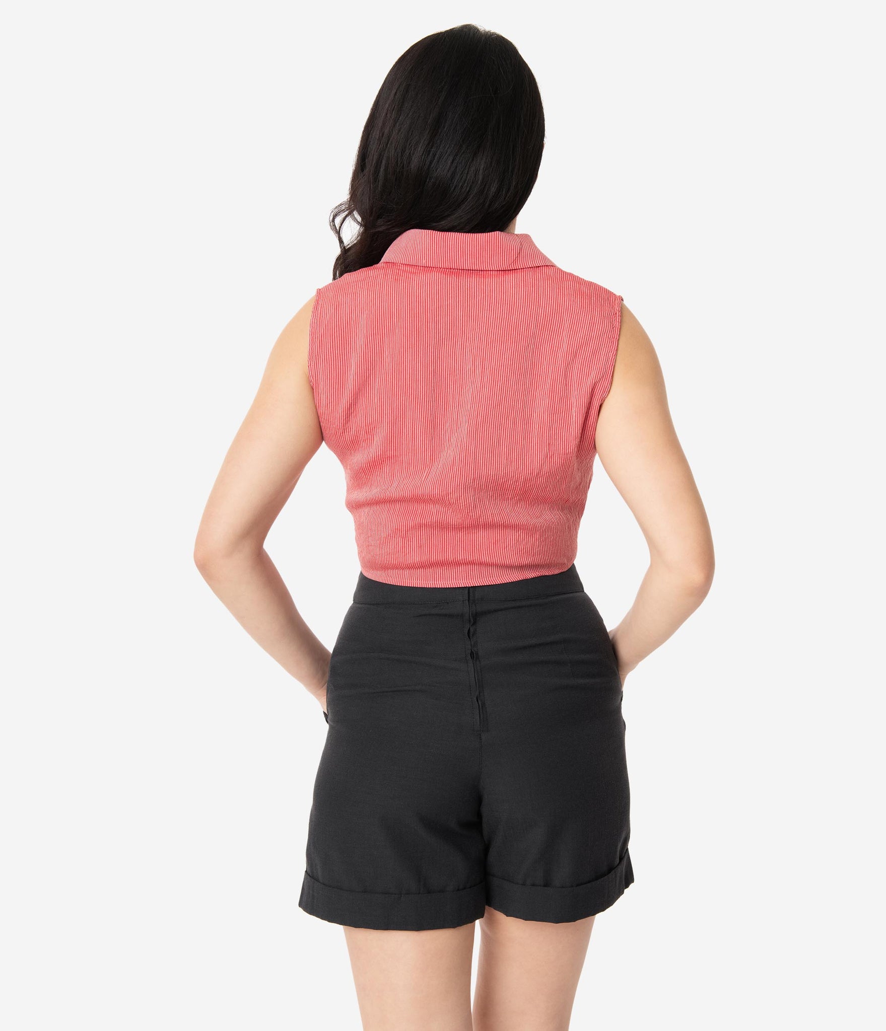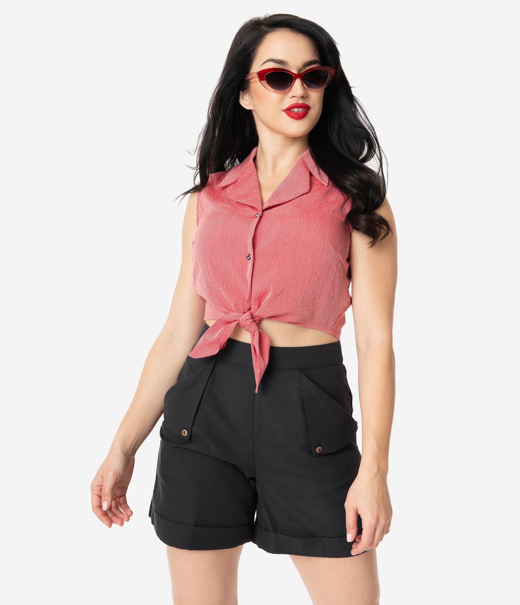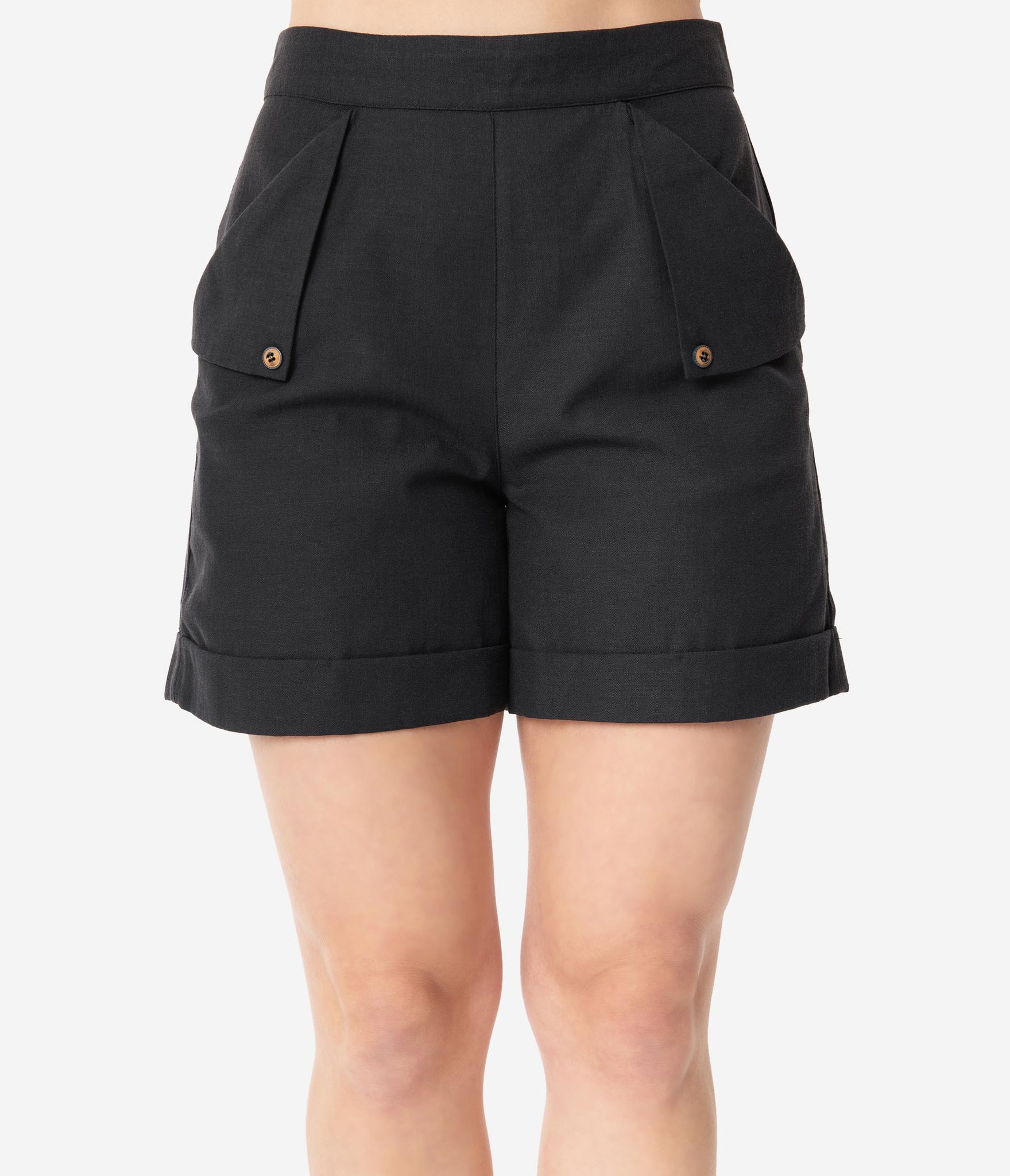 Ahoy, darling! These nautical inspired high waist shorts are your newest wardrobe staple. A linen material with a back zipper and front pockets featuring flaps with faux buttons accented with anchors all come together for a comfortable new piece for your nautical needs. Tie this look together with your favorite nautical tie blouse. The world is yours to sail, babe!