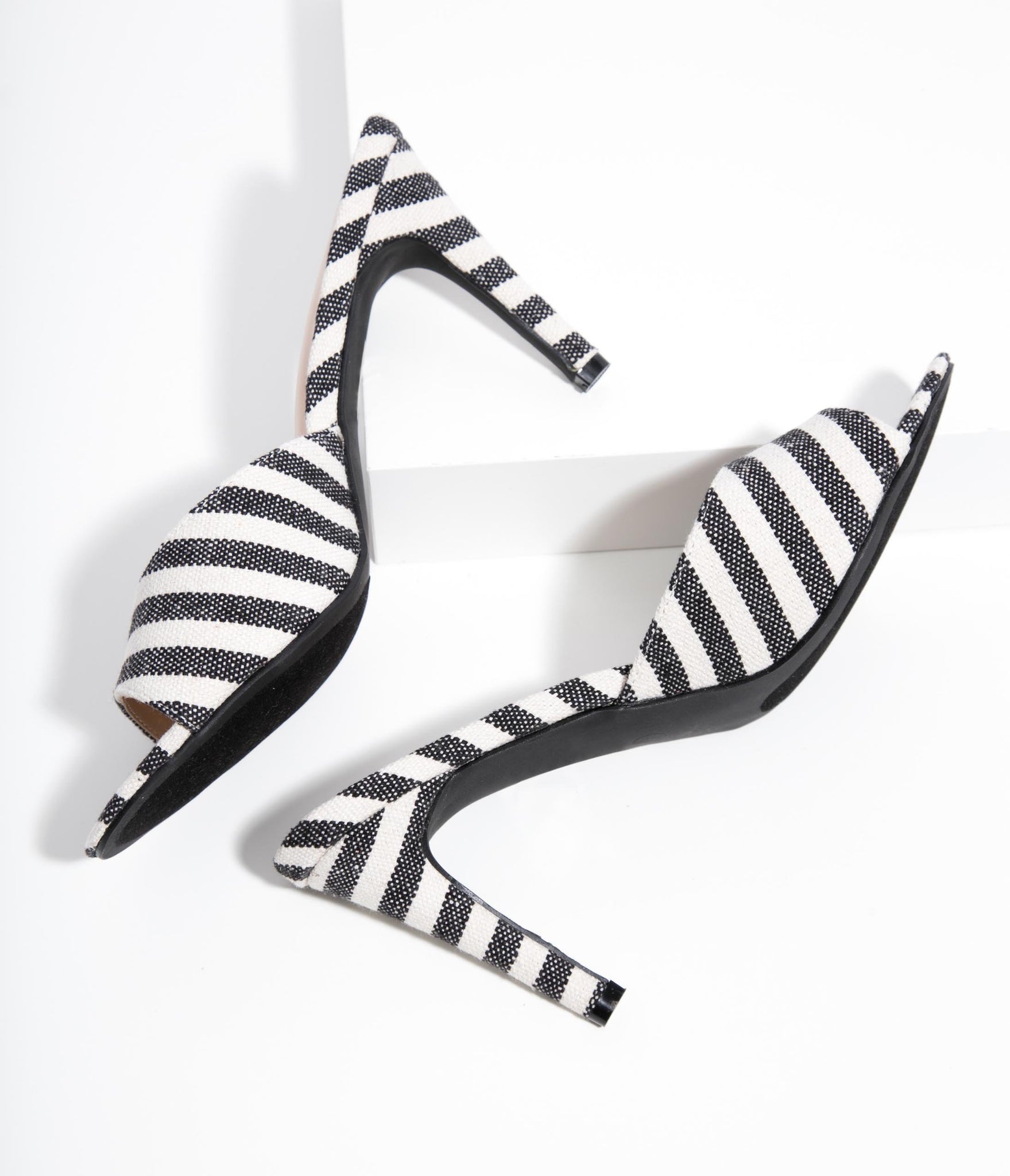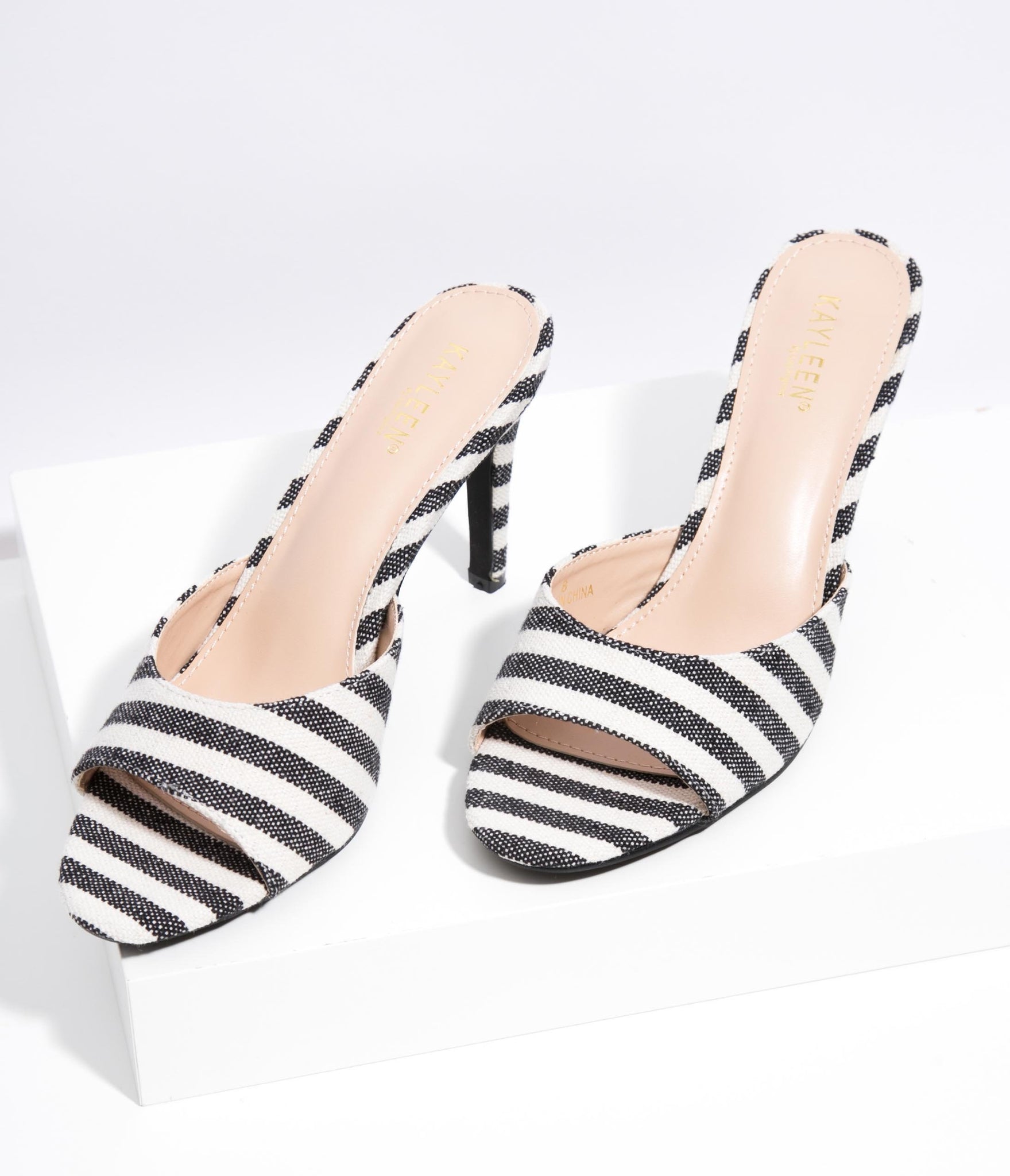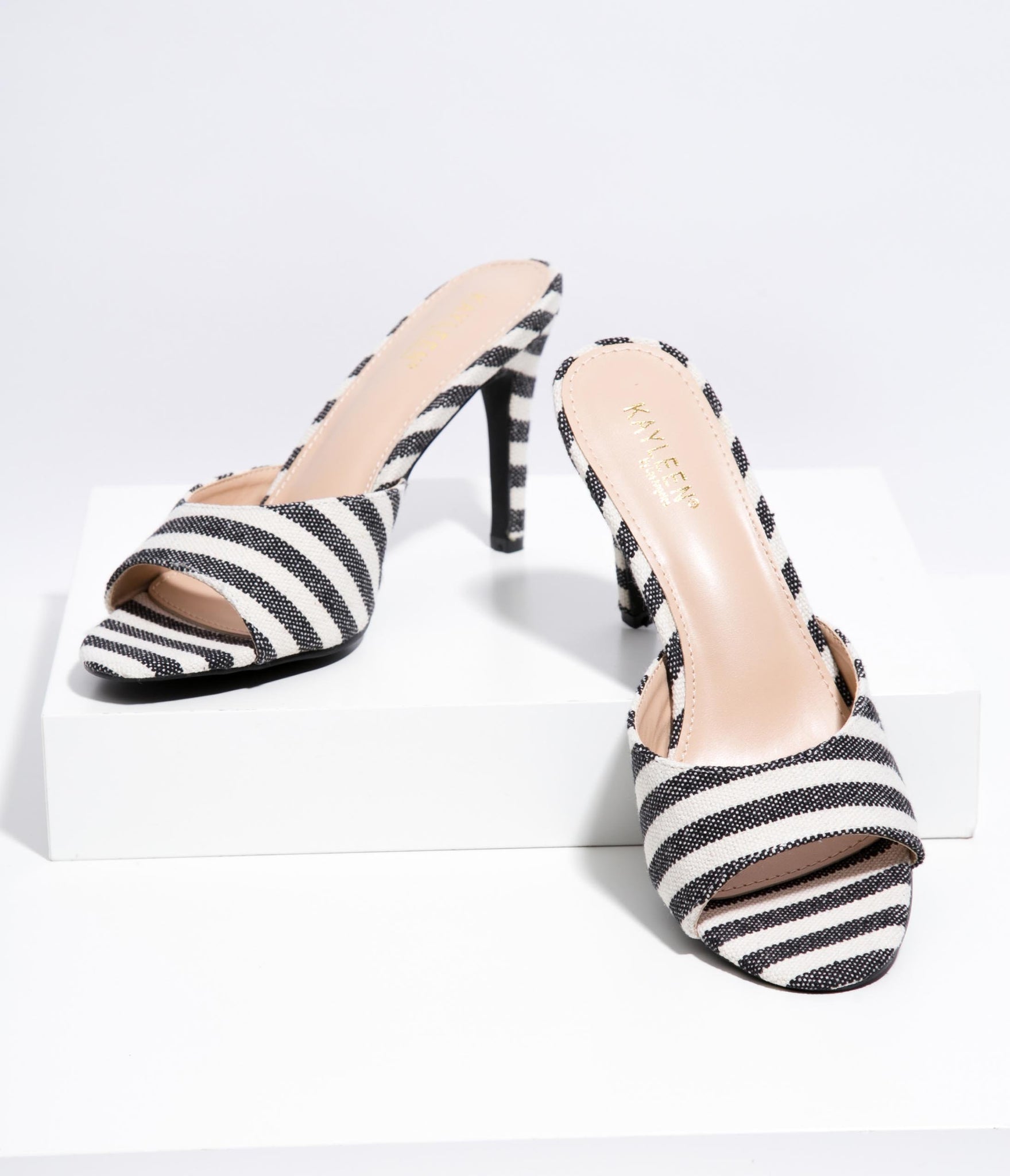 Striped stunning! A pair of wondrous 4 inch kicks, these chic mules boast a woven fabric vamp with a flirtatious peep toe in a fabulous black and ivory striped pattern. Complete with a soft cushioned insole and minimal tread, you can never have enough!
