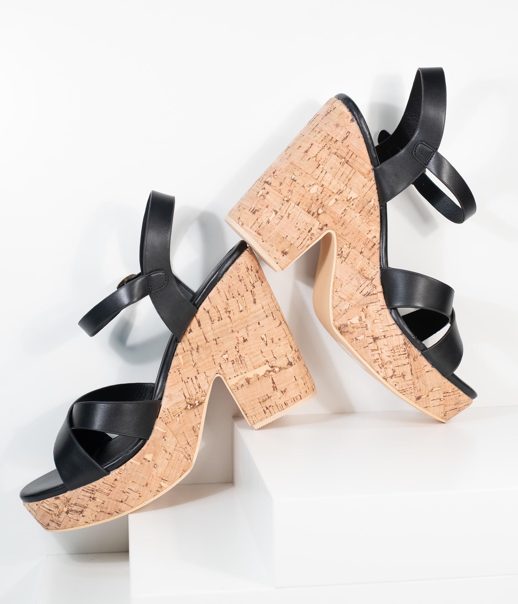 Positively corking! A sassy pair of fabulous cork platforms, these darling pair feature black leatherette straps to show off your toes while the dramatic 1.5 inch platform and 5 inch cork heel provide poolside stature. Outfitted with a cushion insole and a gored and adjustable ankle strap, pop on this pair and strut stunningly!