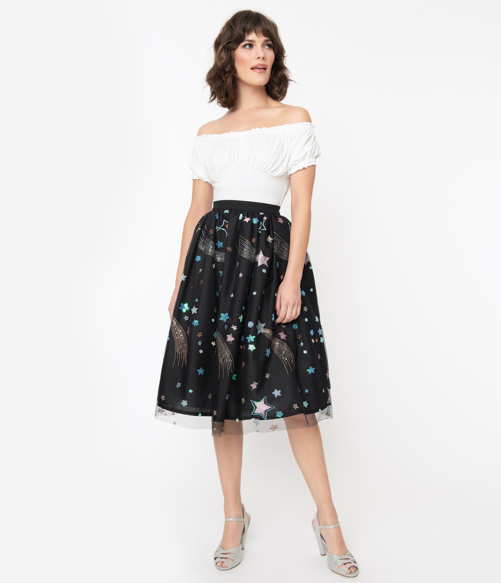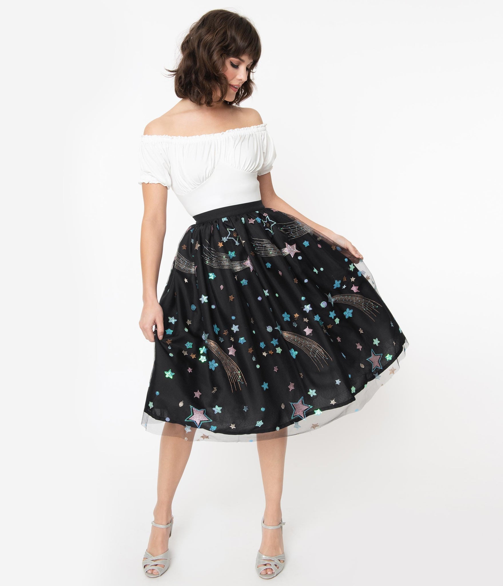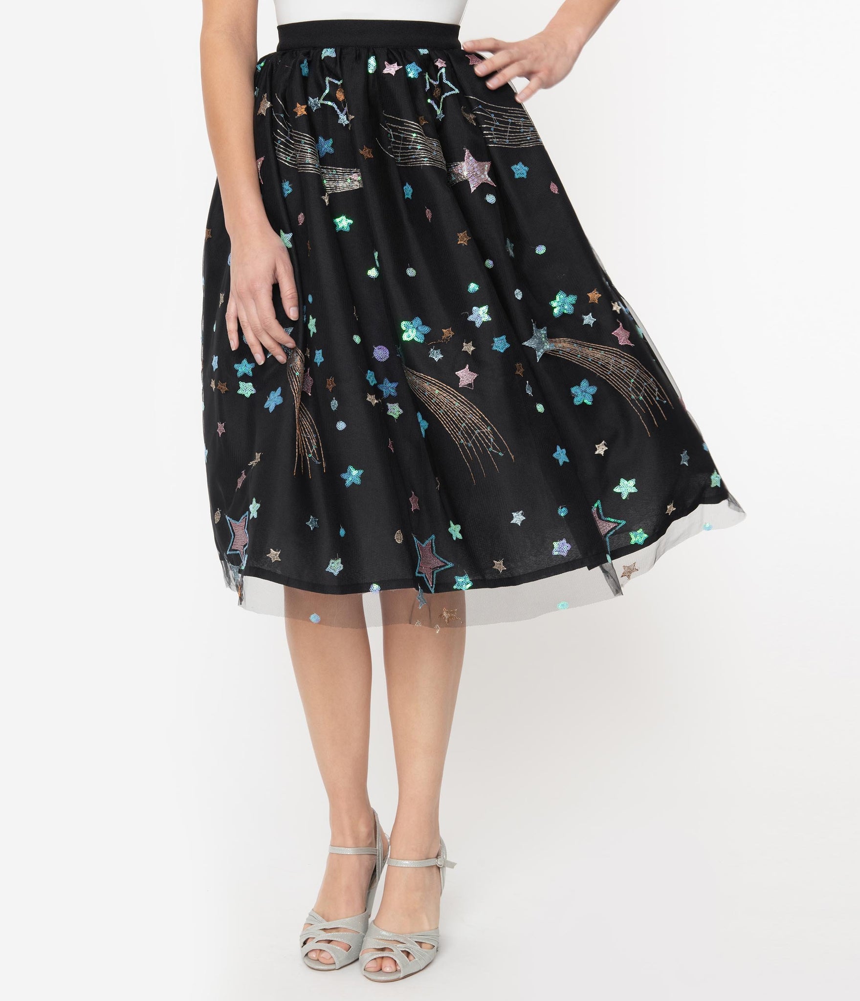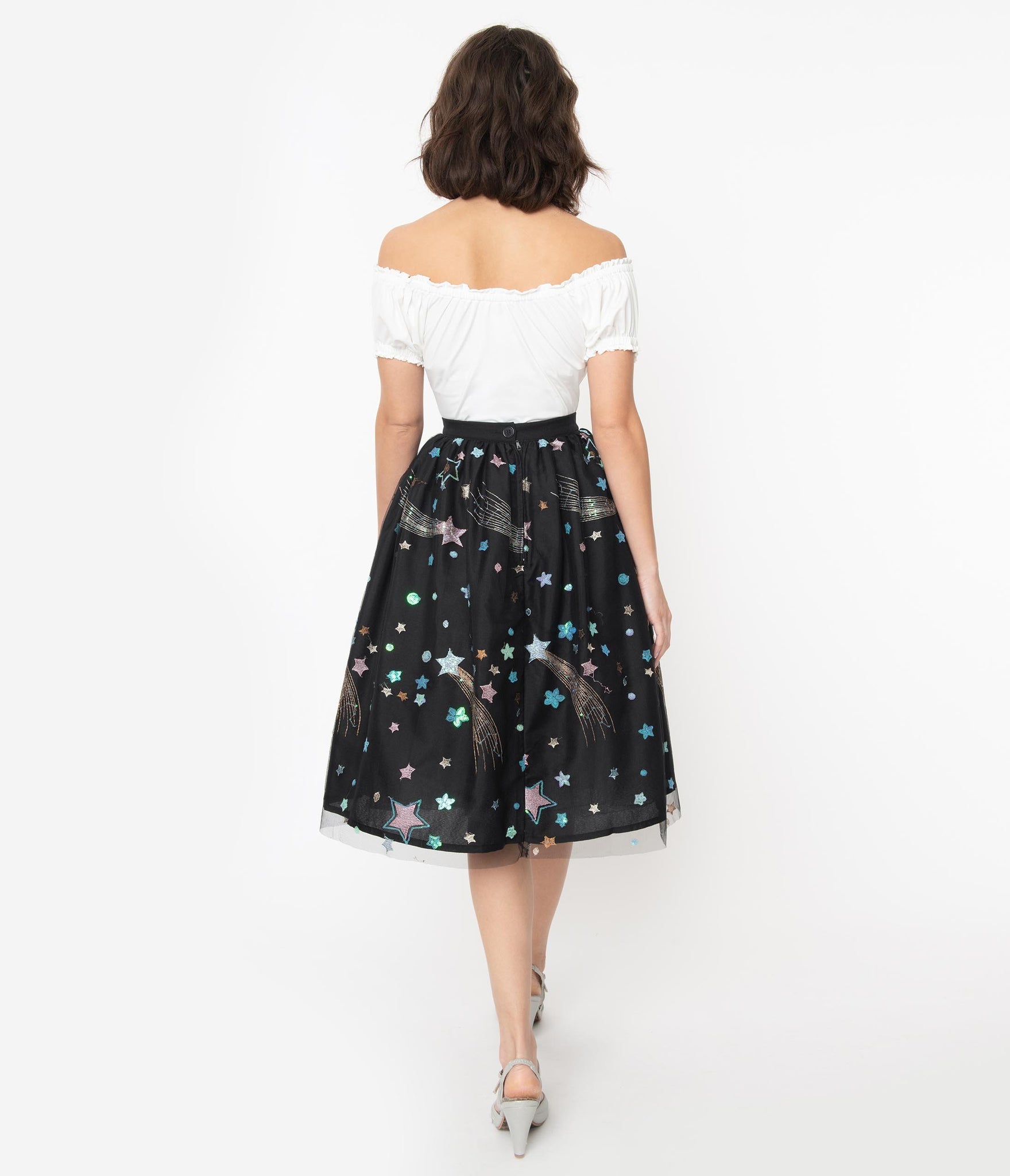 For the stargazer, gals! This shimmering separate is a gorgeous vintage style swing skirt, crafted in a marvelous layer of black mesh over smooth black lining, twinkling with multicolor sequined and metallic threaded shooting stars and dots throughout. The banded waist is cinched in with a back zipper and button for a fashionable sky show!
