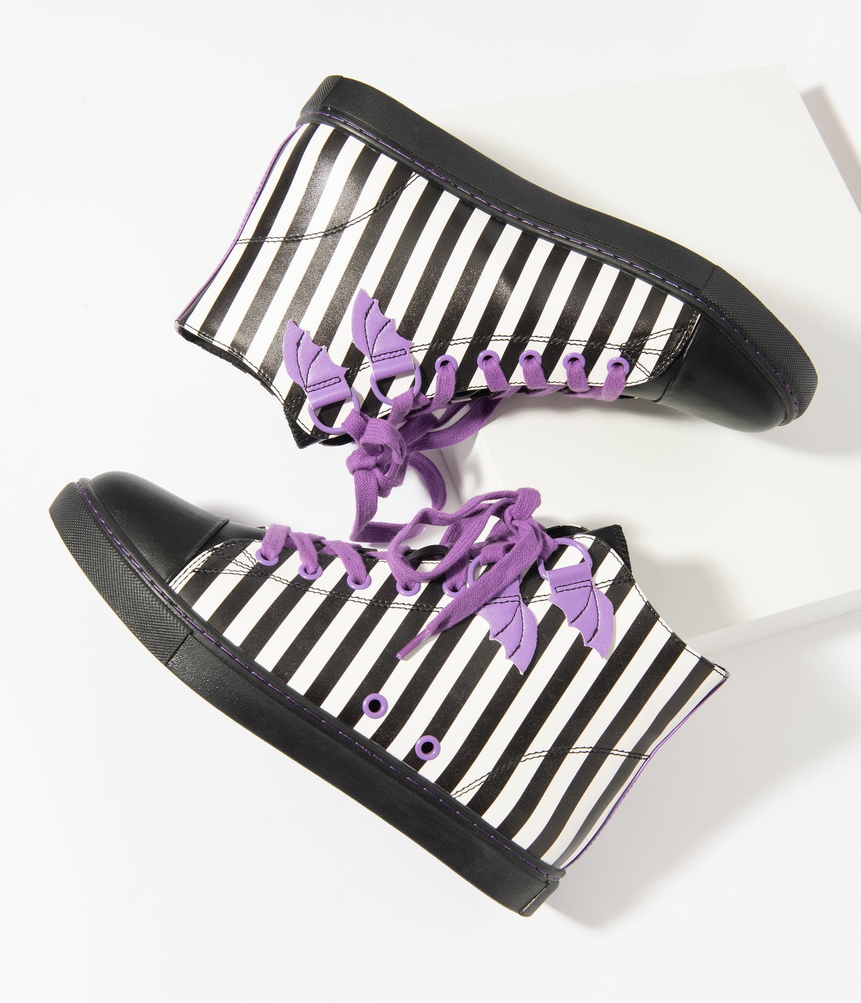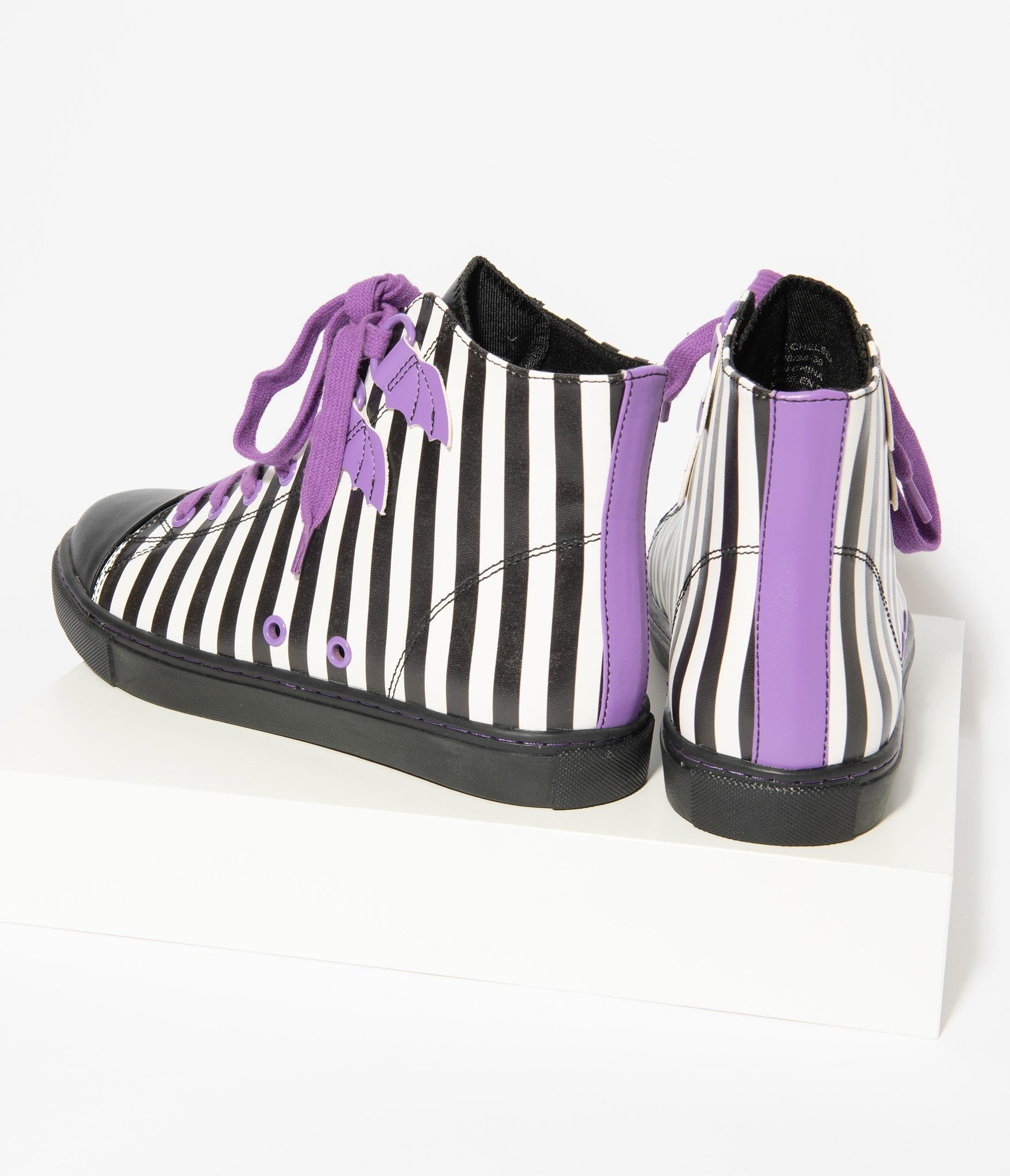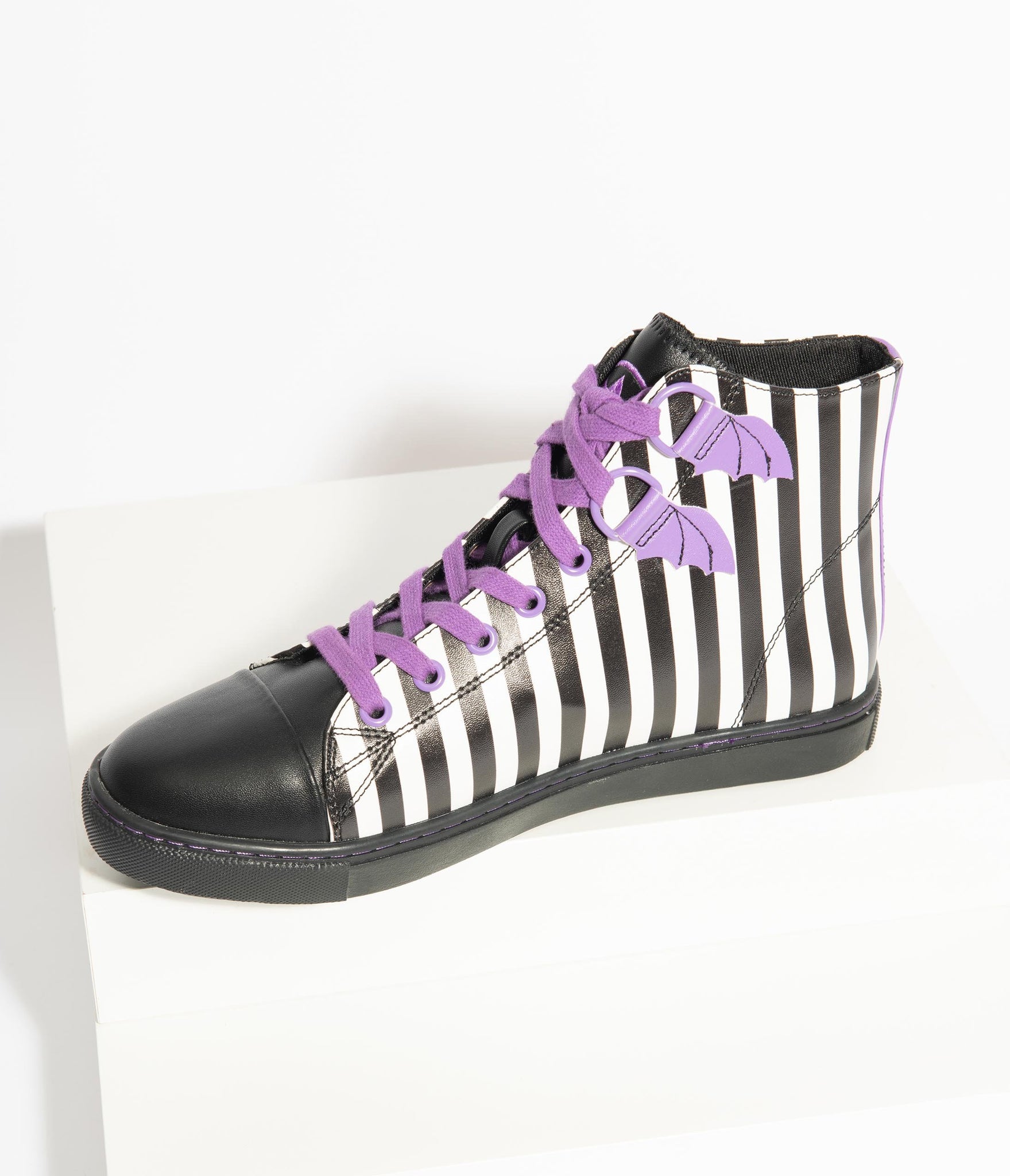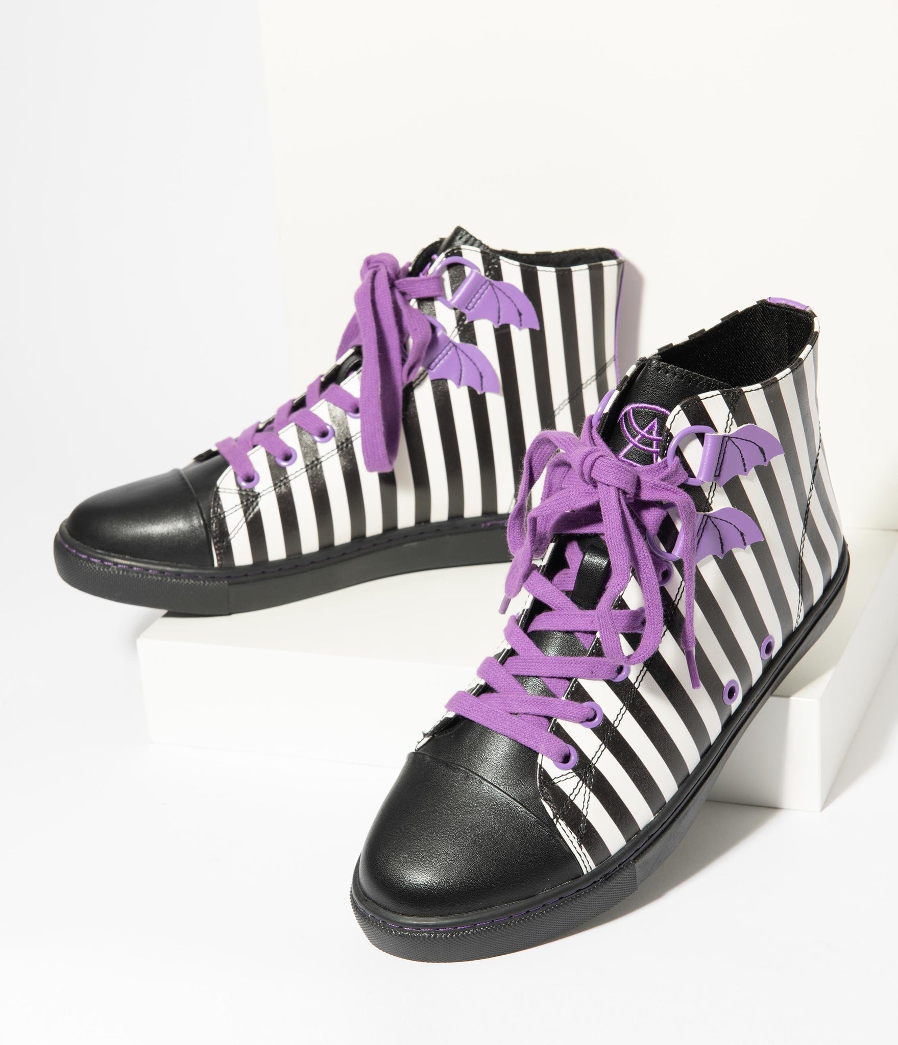 For mischievous sneaking ghouls! These crafty pair are up to no good with it’s eye-catching black and white striped vegan leatherette and purple bat accents. The high top design features a lace up vamp with purple contrast seaming and a black 1 inch rubber sole. Tiny bat wings flare out from the lace up rings while the heel dazzles with a patent leatherette purple stripe.