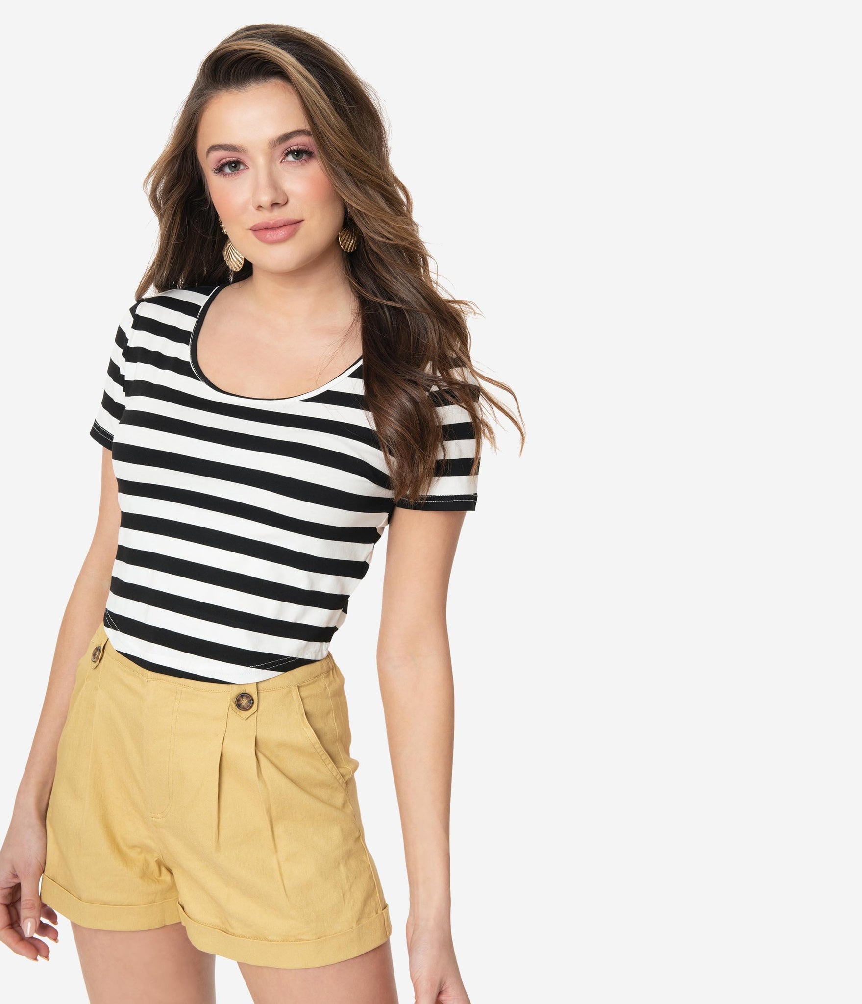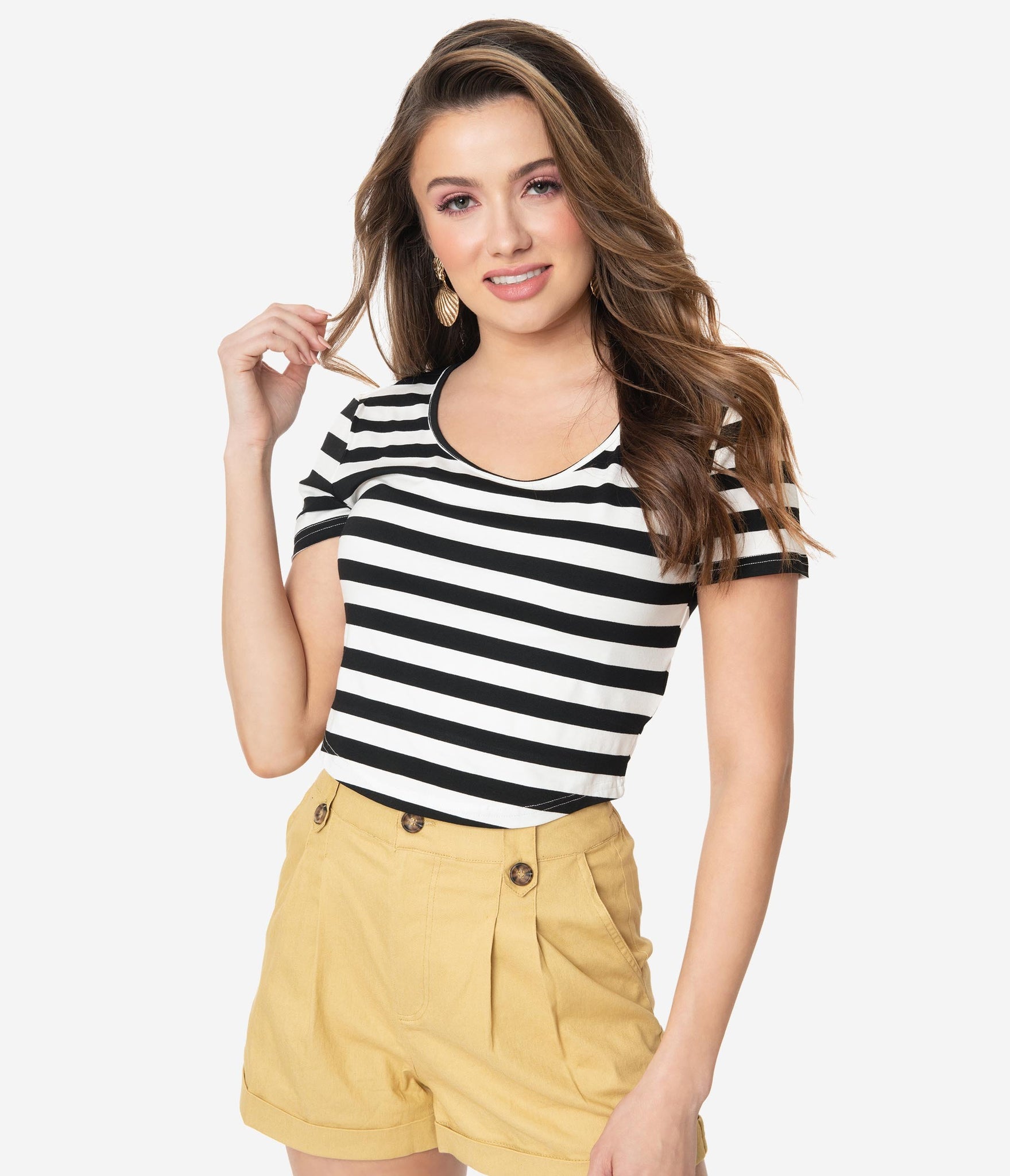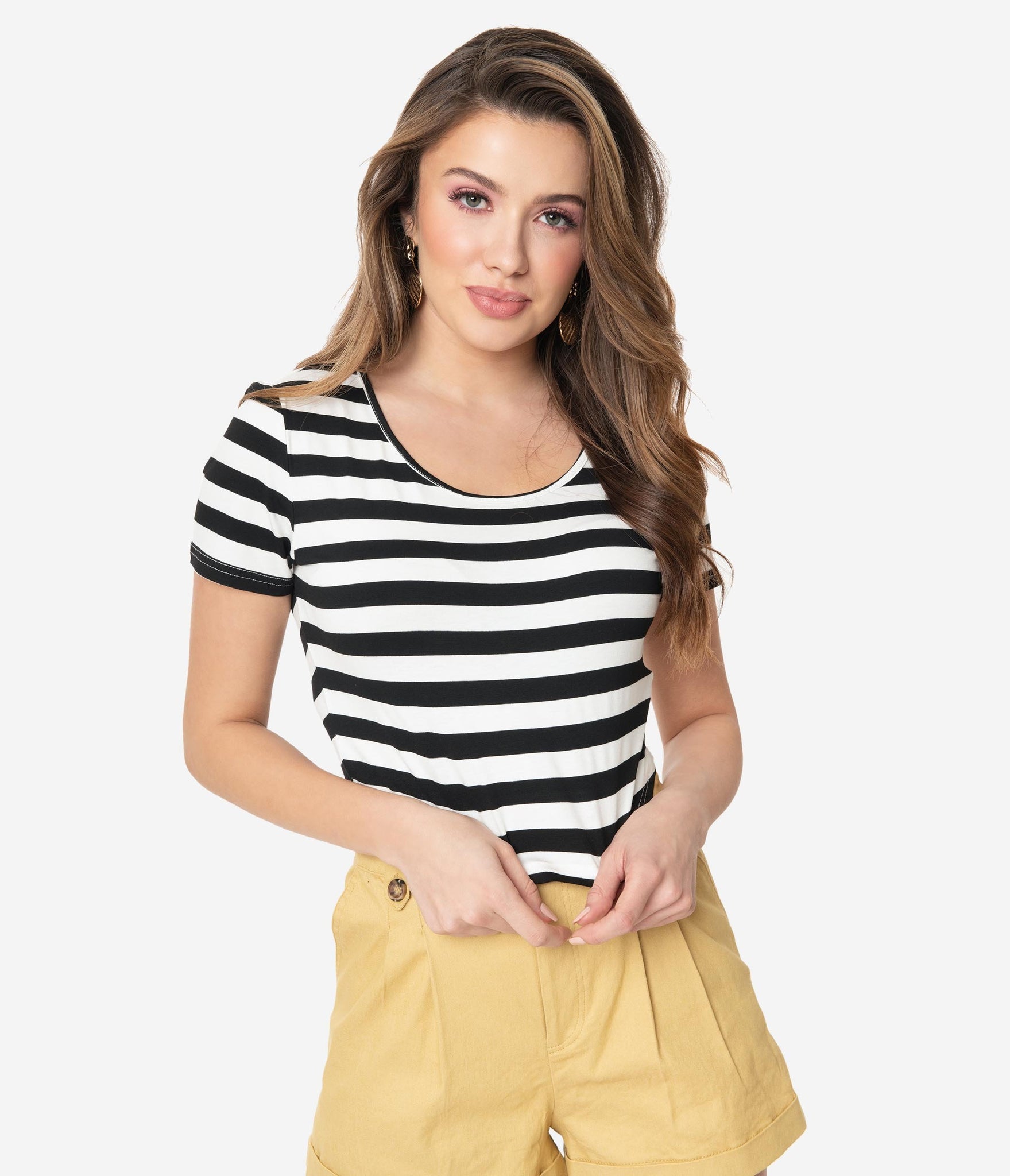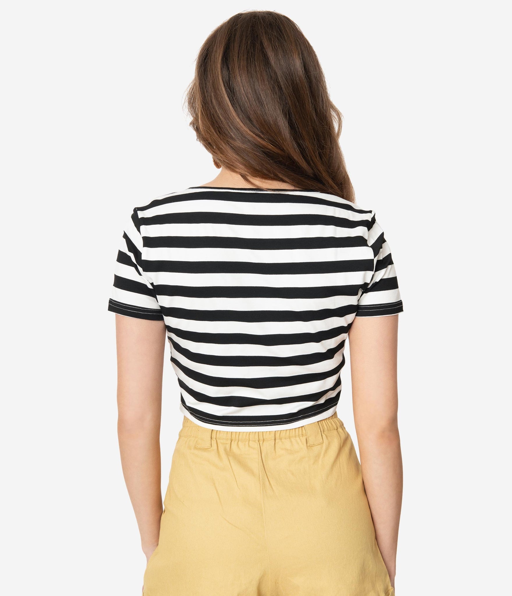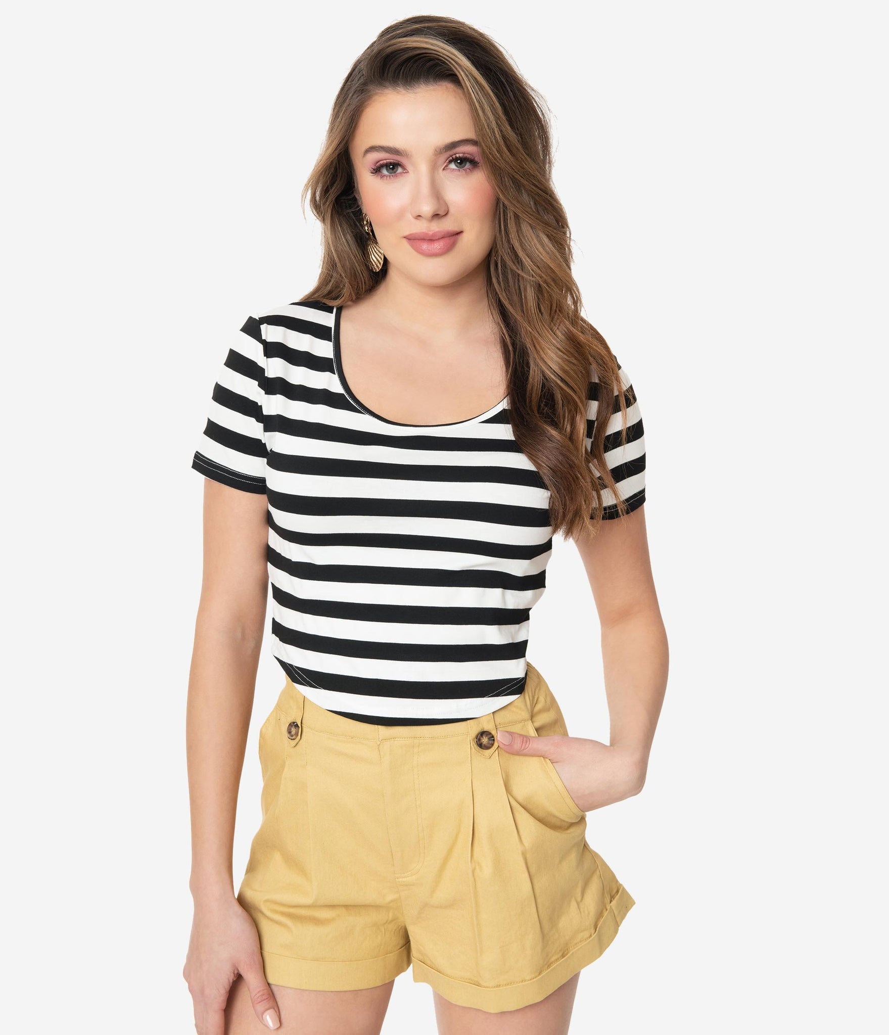 Land ahoy, babe! This black and white striped crop top is perfect for setting the seas in. This crop style is crafted in a stretch fabric with a short sleeve and a scoop neck. Perfectly paired with any of your favorite nautical shorts. Time to set sail, darling!