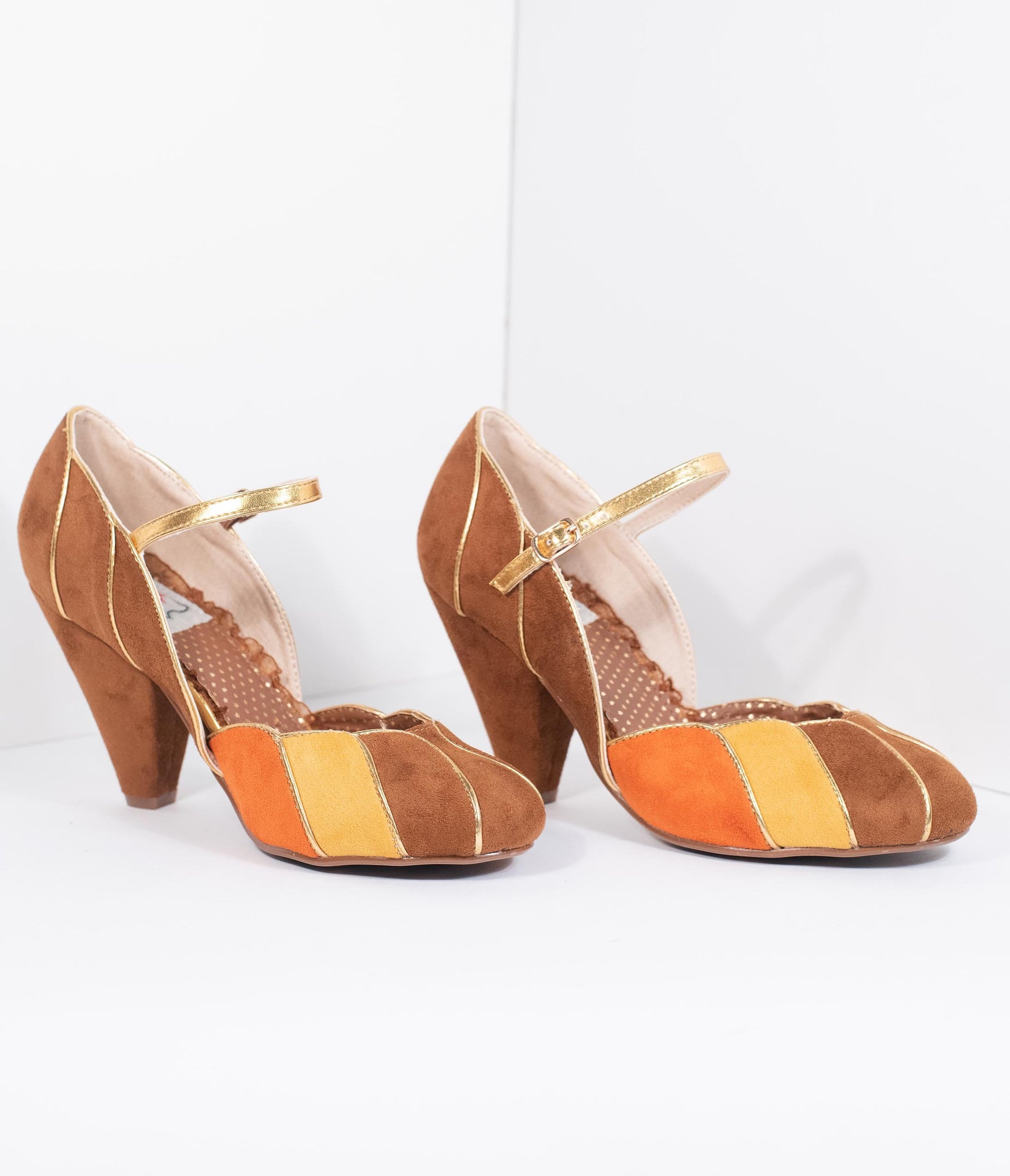 We've found the way to stand out, dames! A set of elegant brown pumps from Bettie Page and crafted in a soft faux suede, featuring pops of yellow and orange colors. The Mary Jane design boasts a scalloped vamp with gleaming piping while the 4” heel provides a stunning lift. The adjustable and gored ankle strap lends a secure fit for a pair of vivacious vintage-inspired stunners!