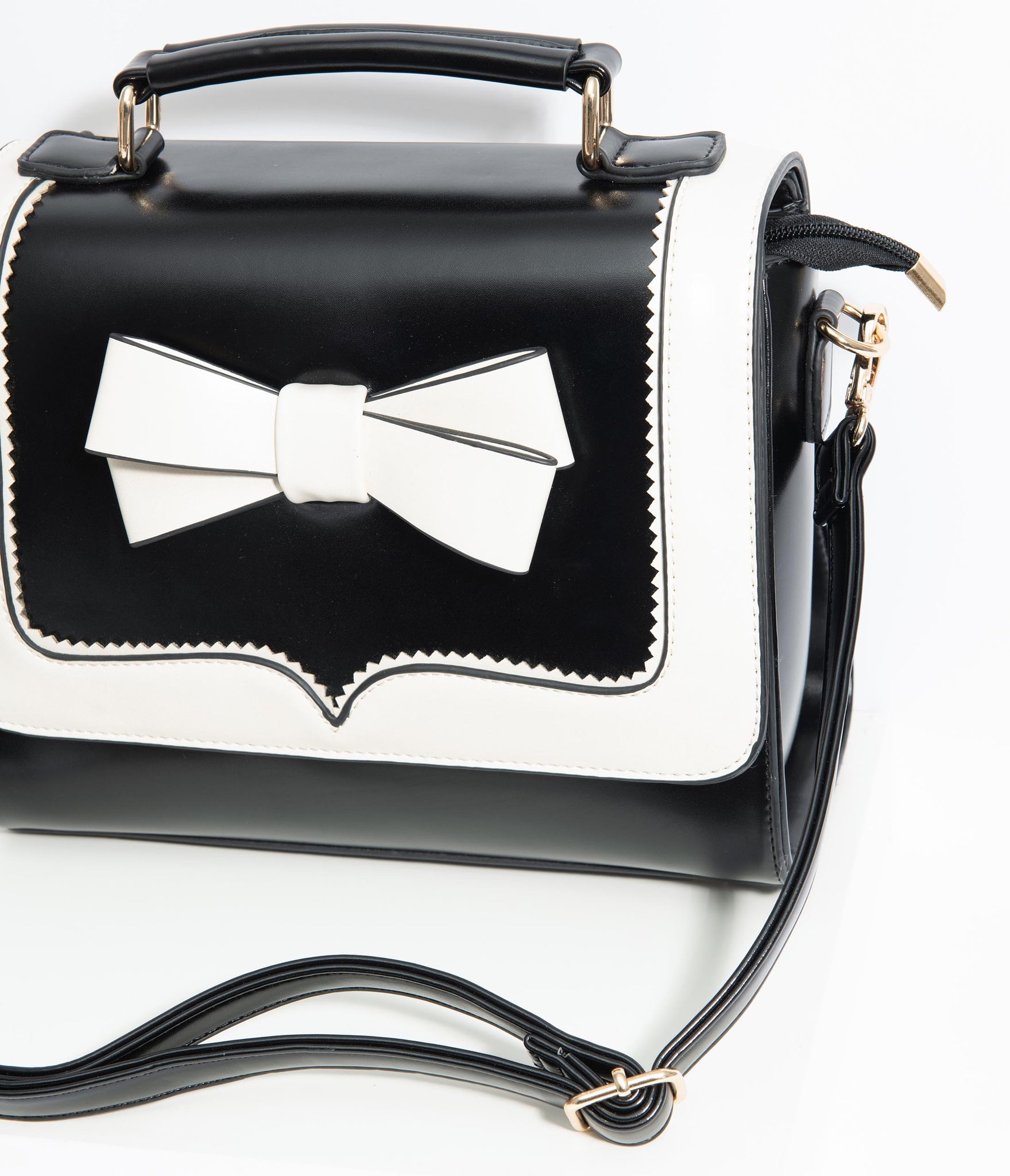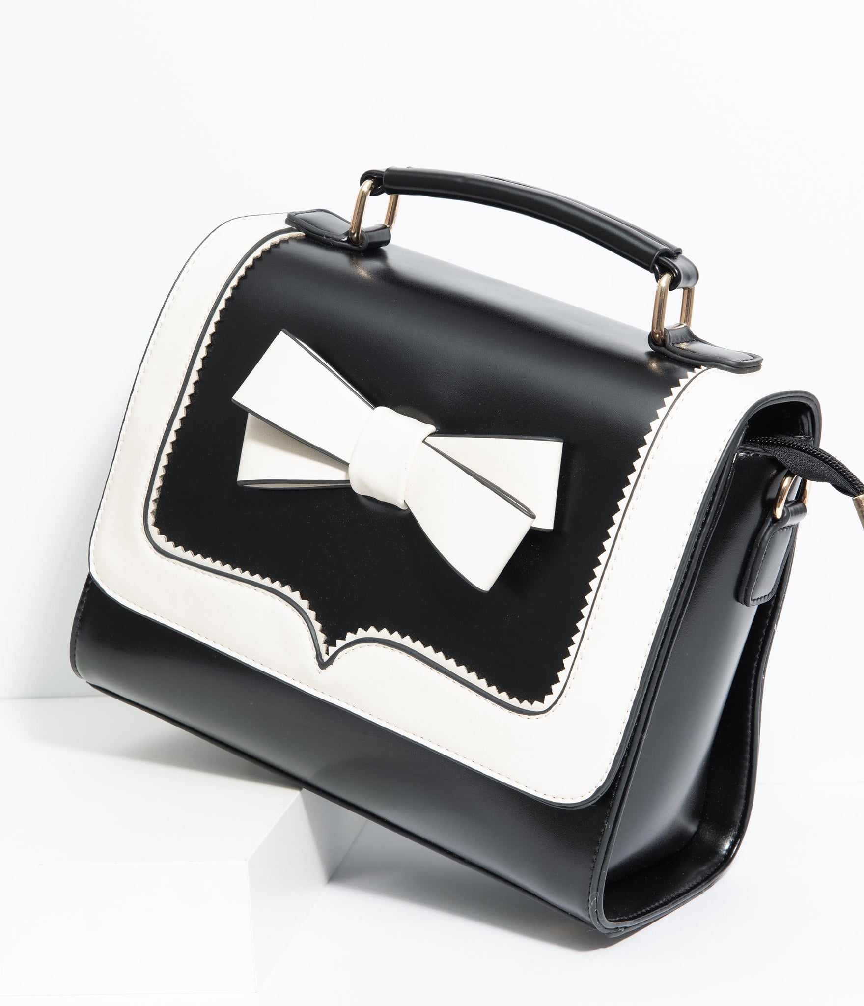A little something sweet, darling! Cast in a black and white leatherette with fabric lining, this purse features a fold over flap that’s secured with double snap closure and embellished with a lovely bow accent. The top handle and removable/adjustable shoulder strap allow for versatile carry as the top zipper pocket keeps your favorite pieces safe. The polka dot interior boasts two inner slip pockets and an inner zipper pocket to make any ensemble elegant and practical. It's a retro must have!
