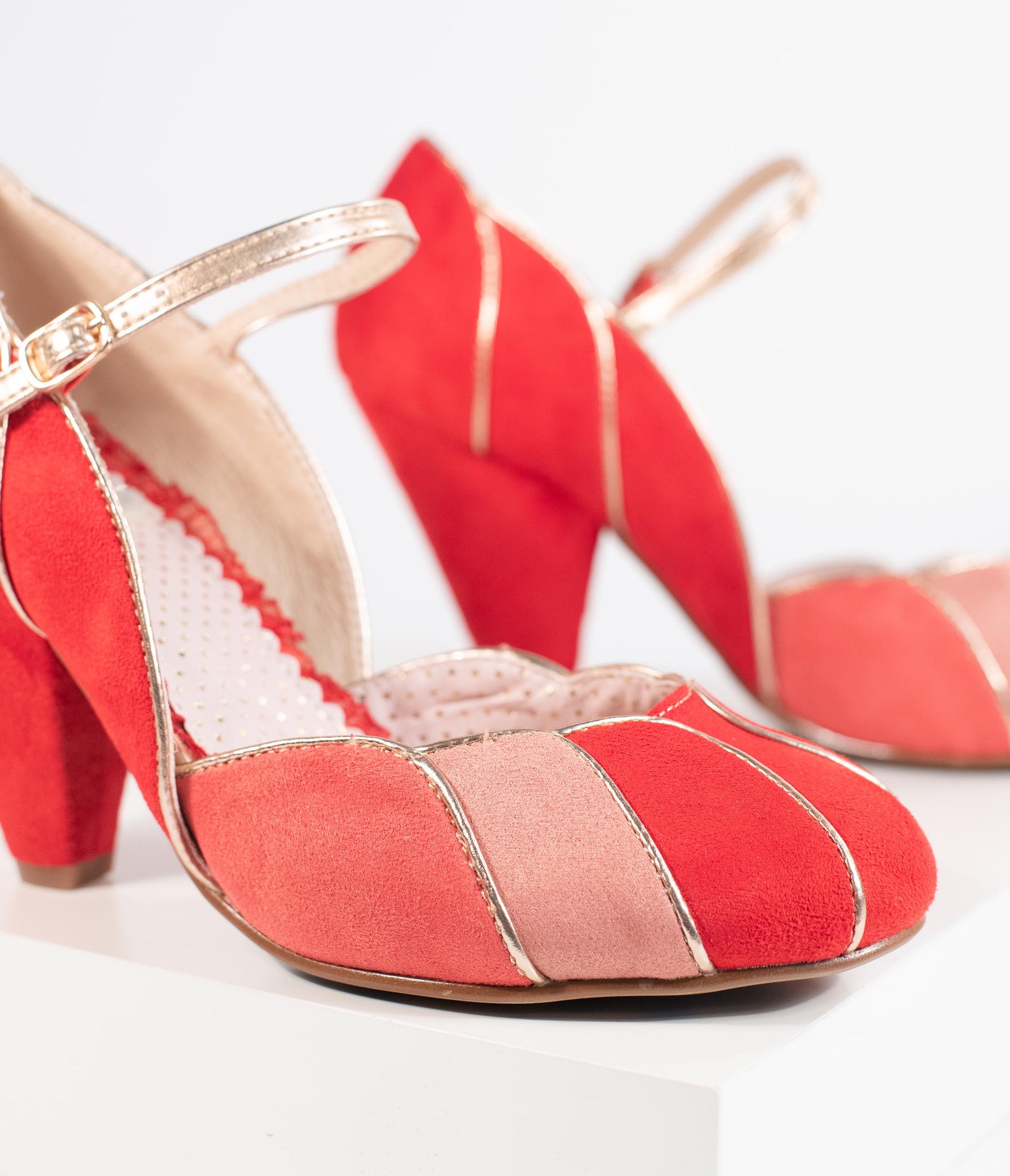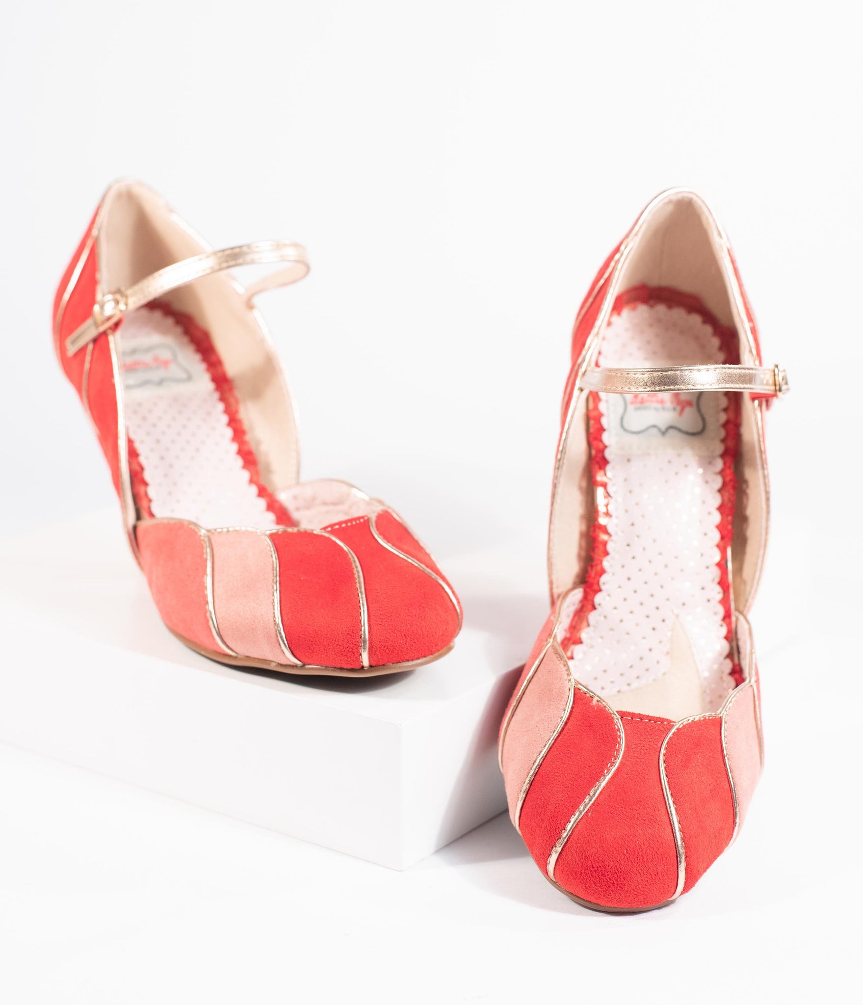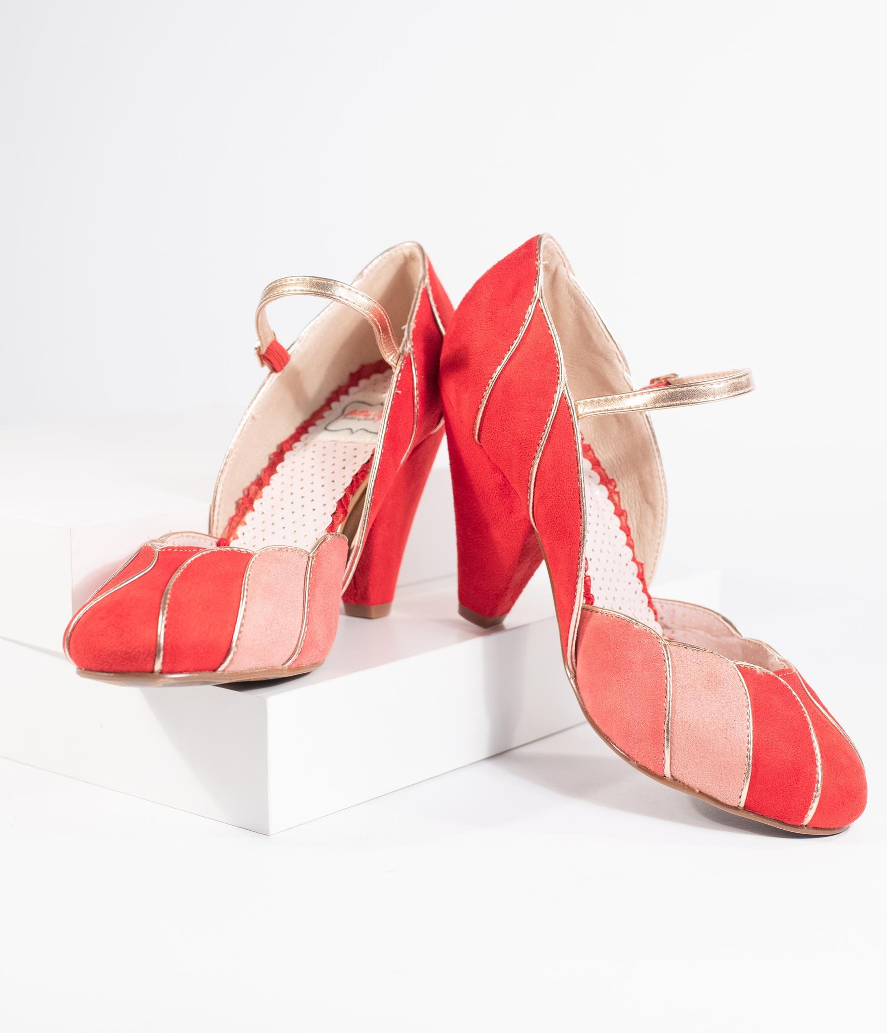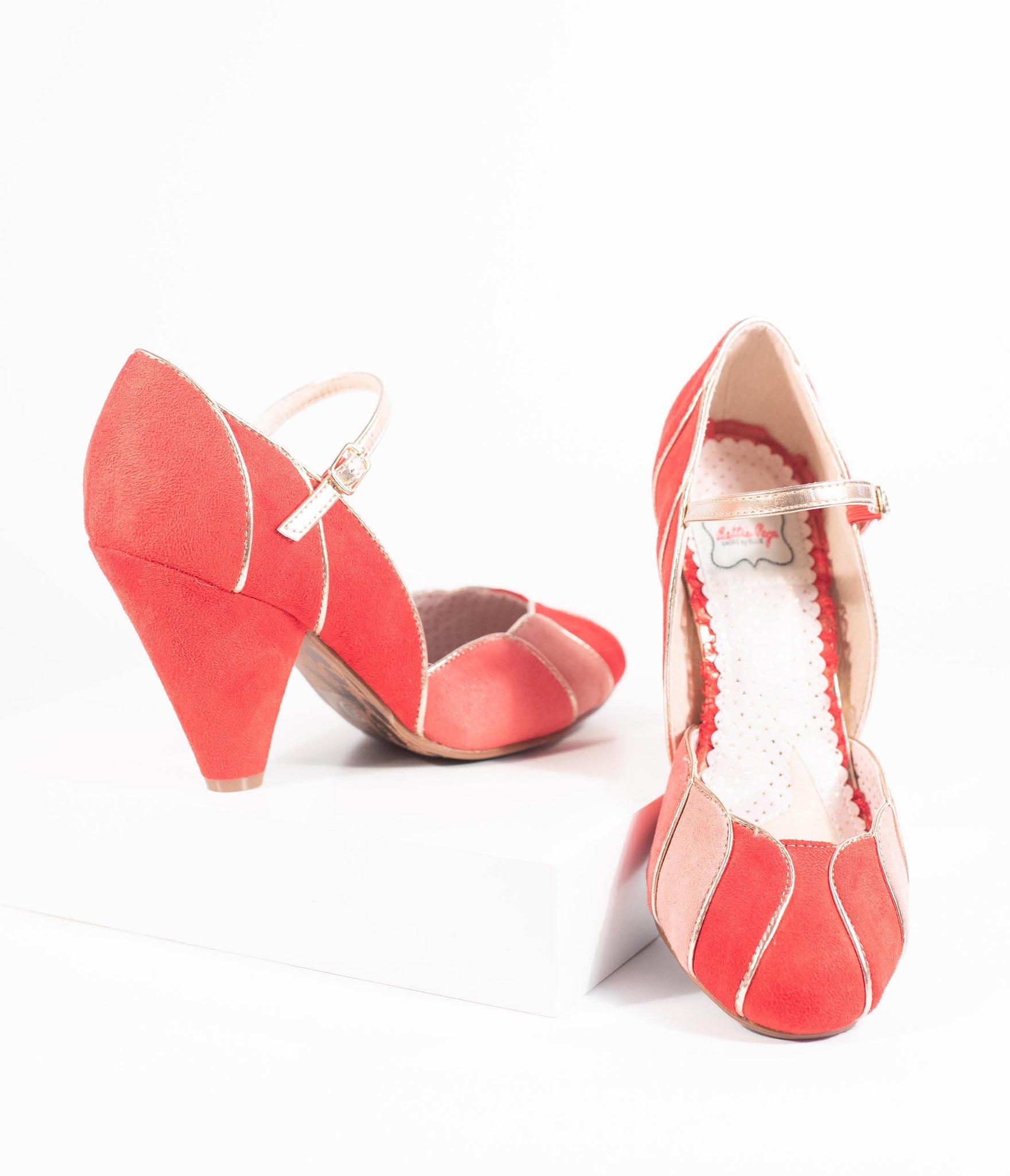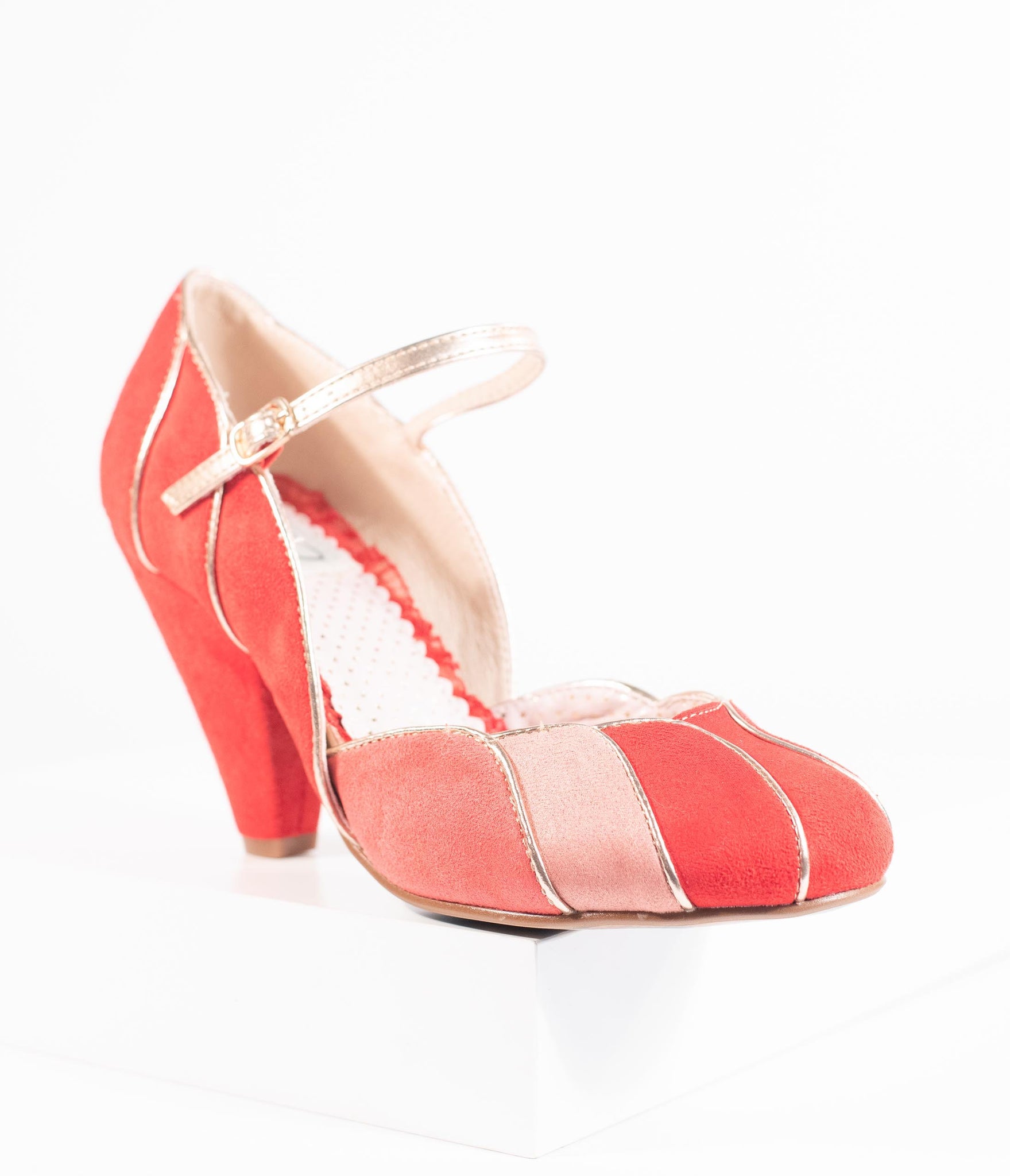 We've found the way to stand out, dames! A set of elegant red pumps from Bettie Page and crafted in a soft faux suede, featuring pops of peach and coral colors. The Mary Jane design boasts a scalloped vamp with gleaming piping while the 4” heel provides a stunning lift. The adjustable and gored ankle strap lends a secure fit for a pair of vivacious vintage-inspired stunners!